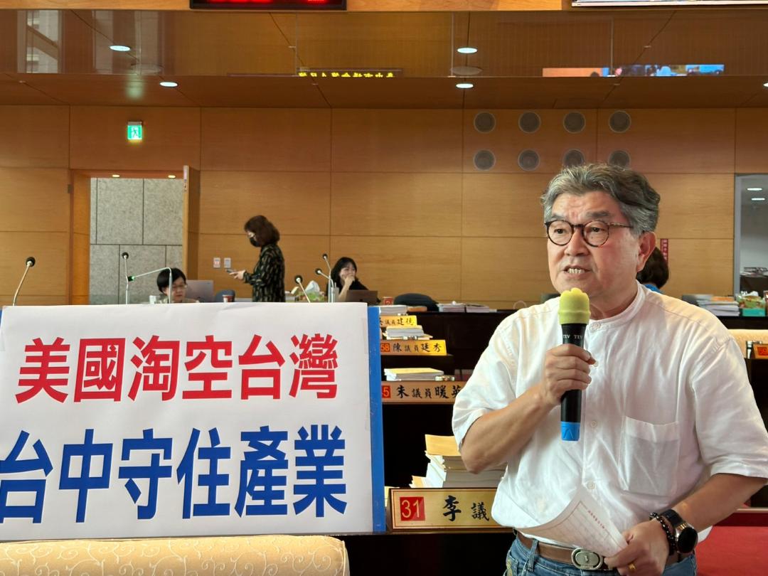 李中說,美國第二目的就是要搬空台灣的產業,台積電與其相關廠商已經被迫到美國建廠,更有許多勞工舉家被迫遷往美國工作,而美國在拿走台灣的高科技產業後,接著又將目標轉移到傳統產業,中部地區是台灣小五金零件生產最集中的地區,市府要特別注意,別讓美國以巨大公司事件為由來淘空台中傳統產業鏈。