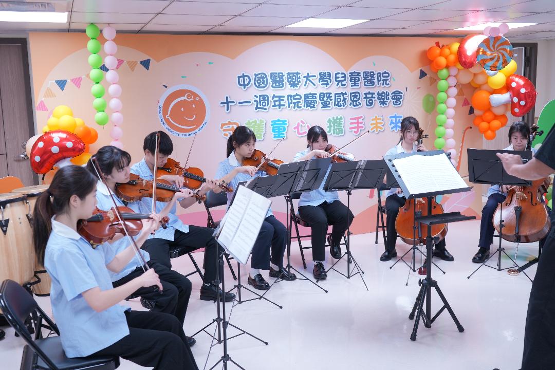 為增添院慶溫馨,特別邀請南投高級中學音樂班師生帶來義演的感恩音樂會,透過合唱與管弦樂表演,讓悠揚樂聲在會場中迴盪,象徵醫院十一年來孕育出的愛與希望,也讓許多在場的病童與家屬,隨著音樂露出笑容,氛圍感人至深。