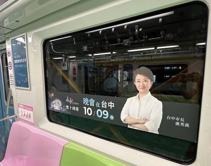 陳俞融質疑,盧市府對於國家慶典如此消極,但對於宣傳市長個人,卻是鋪天蓋地、不遺餘力!市民搭乘捷運,一進車廂就看到盧市長的個人照片,請問臺中捷運是市長個人的宣傳工具嗎?市府有錢、有資源把市長的照片放到捷運車廂,卻沒錢、沒心思把國旗好好地掛在台灣大道上?
