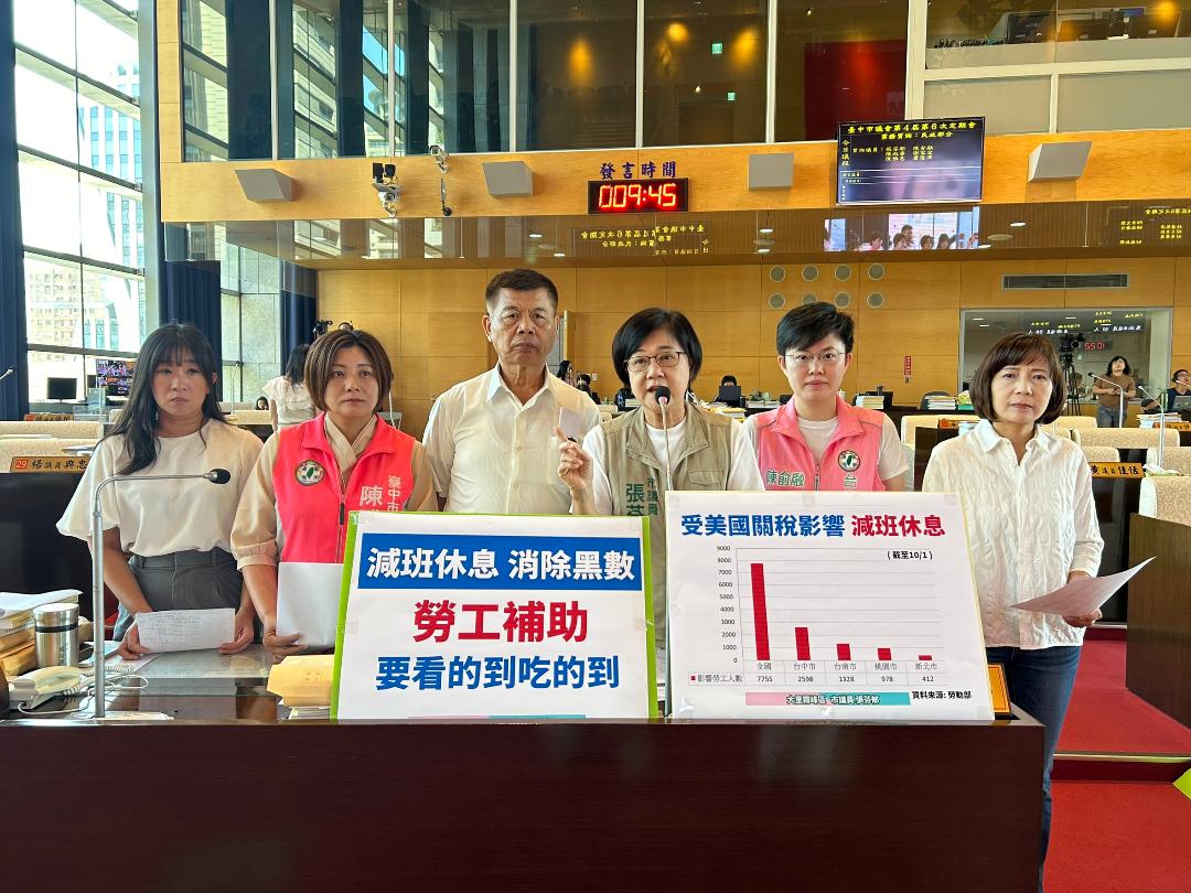 受美國課徵對等關稅影響,據勞動部統計,截至十月初,全國共有310家廠商、7,755名勞工實施減班休息,其中台中市就有117家、2,598名勞工受影響,占比約三分之一,全台之首。台中市議員張芬郁指出,中央推出多項安定就業措施,但台中市在各項政策補助的申請率明顯偏低,其中「雇用安定措施」申請率僅15.4%、「再充電計畫」申請率更只有2.5%,顯示台中市勞工局推行力道不足。市議員張芬郁呼籲勞工局應積極去掌握未通報黑數、鼓勵輔導企業通報與申請,不要讓中央補助淪為一談,勞工補助看的到吃不到。