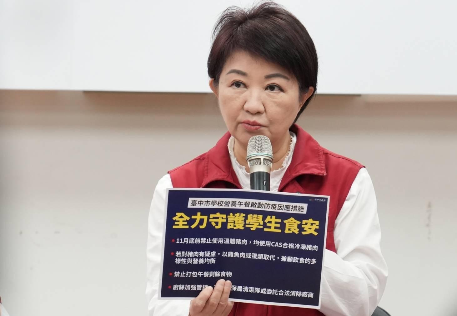 盧市長說明,食安措施分為兩部分,第一、針對學校營養午餐,10月底前全面禁用溫體豬肉,需採用CAS認證冷凍豬肉,學校若對豬肉有疑慮,可以雞、鴨、魚肉或蛋類取代,兼顧營養均衡。同時禁止將午餐打包外帶,以防保存不當產生風險,相關廚餘將由環保局及合格清除廠商加強管控與流向管理。第二、實施市場監控,台中市現有168場養豬場及大安肉品市場,將於3天內完成全部訪視。針對全市30處公有市場、193家生鮮豬肉供應商及13處民有市場共40家業者,及各賣場,加強稽查。同步監控替代肉品(如雞肉、雞蛋)價格與供應量,確保市場穩定。