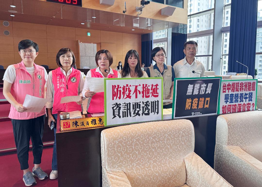 陳雅惠、謝家宜、陳淑華、陳俞融、蕭隆澤及張芬郁議員關心非洲豬瘟疫情,批評市府通報延誤、資訊不透明,要求立即建立跨局處通報與應變機制,建立單一通報窗口與統一應變流程,避免防疫再度慢半拍。