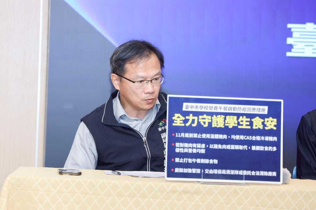 教育局已要求中市所有學校使用CAS冷凍豬肉的產品烹煮營養午餐,且即日起禁止使用溫體豬肉,允許學校或午餐廠商調整午餐菜單,可改用魚肉、雞,或蛋豆類的製品作為替代食材,兼顧孩子營養均衡。同時也禁止學校師生打包午餐剩食,避免後續相關傳播的風險。針對學校廚餘的清運,教育局將與環保局協力合作,提供師生安心食用的教育環境。