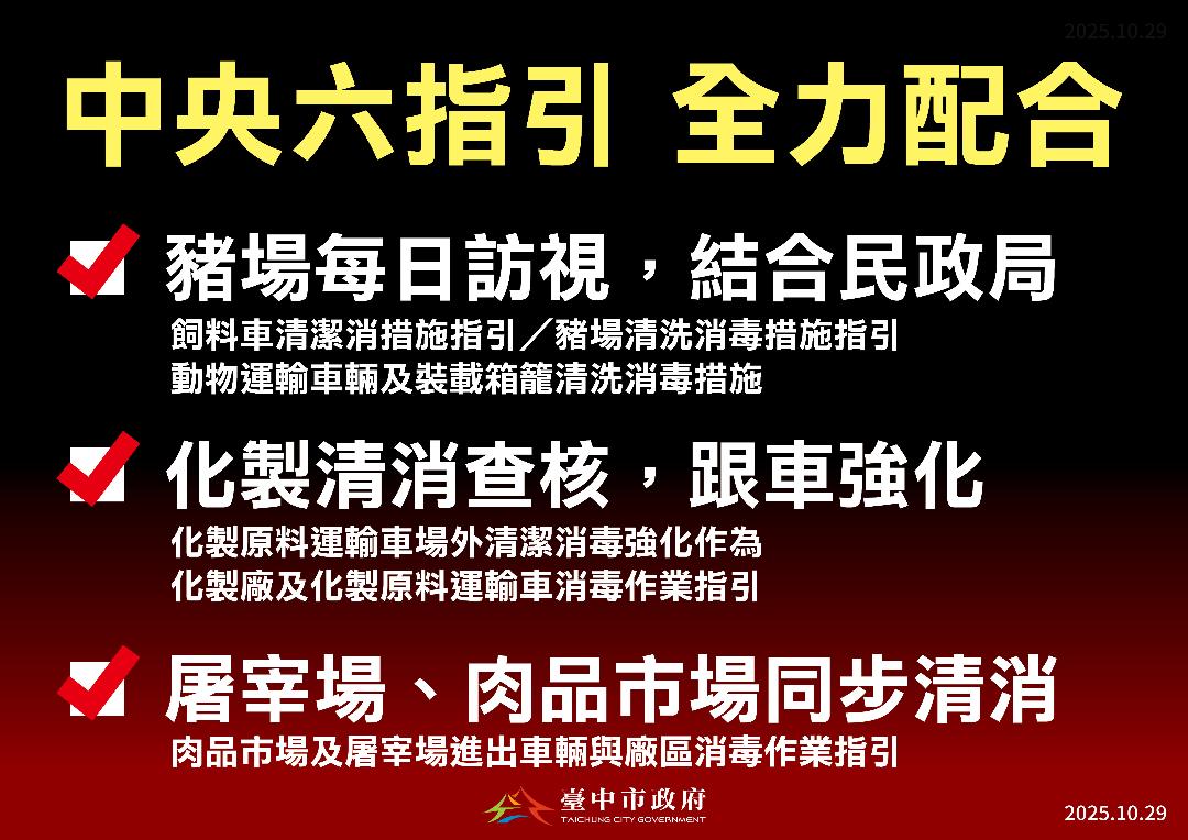 非洲豬瘟中央前進應變所及台中市政府今(29)日再度召開記者會,說明最新疫情處理進度與後續應變作為。市長盧秀燕表示,中央昨(28)日傍晚發布最新防疫指引,市府連夜召集局處首長與同仁重新調整任務與分工,全力落實第二輪「守住階段」防疫工作;她強調,市府態度明確堅定,目標是將疫情完全鎖定在個案場內,杜絕外溢、盡速清零解封。副市長鄭照新指出,台中防疫進入第二輪守住階段第3天,除拼圖般逐步重建事件全貌對外公布,並同步強化清消、稽查、掩埋與能源化處理等6項工作,與中央緊密合作、全力防堵疫情。行政院長卓榮泰有說重話,要對台中市進行行政調查。對此,盧秀燕市長表示,中市府也同步進行行政調查,同仁若有疏失,絕不寬待,絕不包庇,但多數同仁日以繼夜,進行防疫任務,案情結束後也會獎勵,一定賞罰分明。