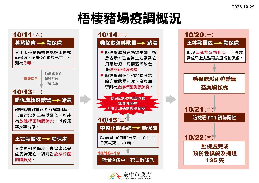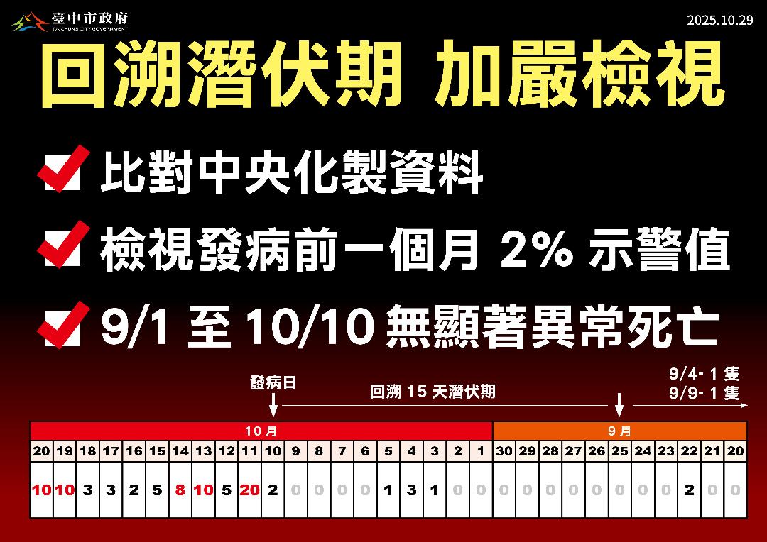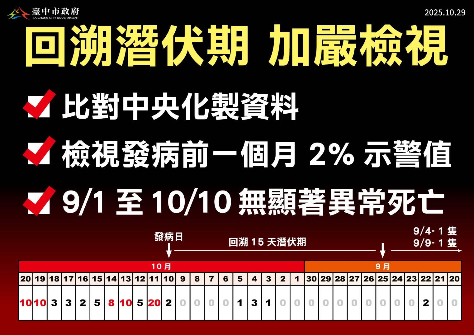 鄭副市長補充,台中市已完成中央要求的疫調回溯,比對中央化製資料,檢視豬隻發病前一個月的2%示警值,確認案場自9月1日至10月10日豬隻死亡數並無異常,市府將持續比對化製廠與蒸煮廠三聯單資料,確保資料一致、追查徹底。他也強調,疫調過程需逐一釐清相關人員陳述與事證,並非說法反覆,而是如同拼圖般完整重建事件全貌。