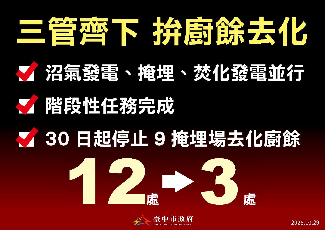環保局指出,市府依中央指引採掩埋、焚化發電、生質能發電及肥料化等多元方式去化廚餘,並開放文山及烏日焚化廠作為養豬廚餘收受場所。環保局強調,將持續彈性調度分流,並依環境部指導加強消毒與覆蓋作業,確保防疫安全及環境衛生。