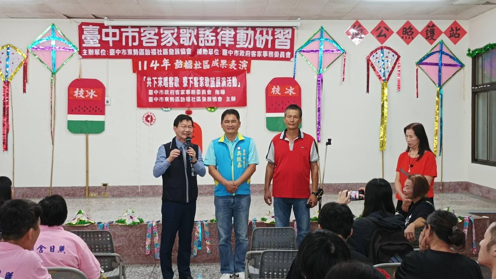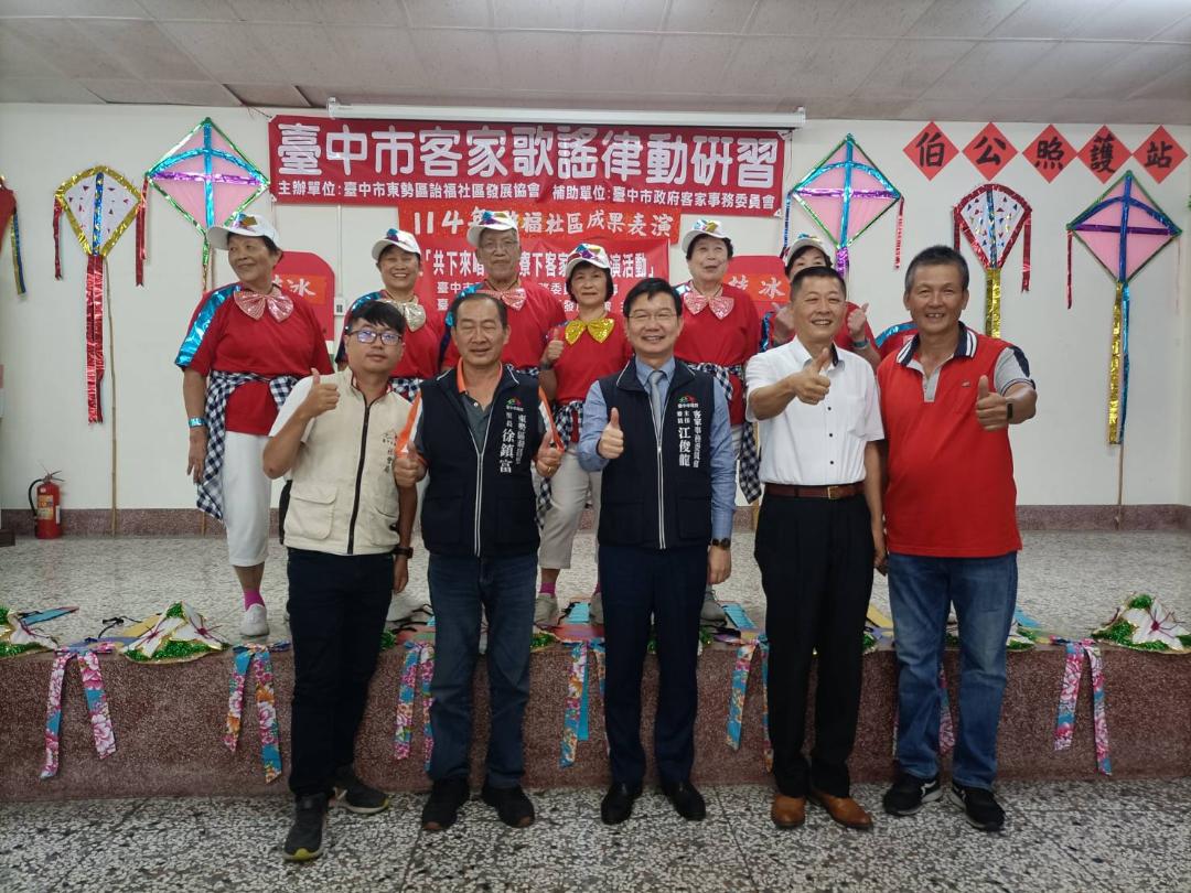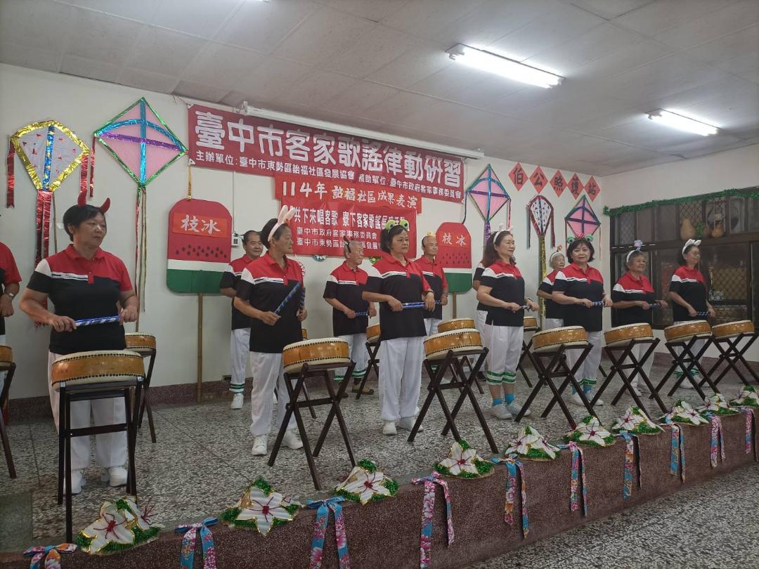台中市府客委會輔導台中市東勢區詒福社區發展協會於今(30)日上午在東勢詒福社區活動中心舉辦「114年度伯公照護站成果聯誼表演」活動,此次成果發表還邀集了上城、下城、泰昌社區等四處「伯公照護站」及東勢農會樂齡學習中心、同舍日照、東舍日照等社團機構,展現豐碩學習成果與滿滿活力。