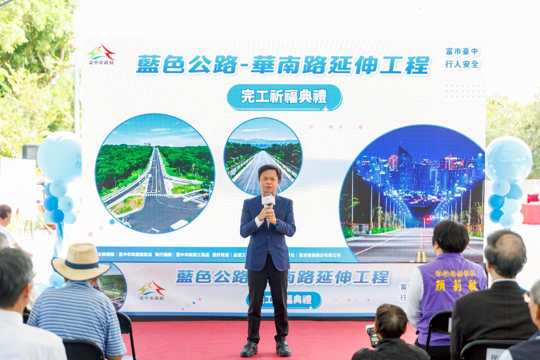 建設局長陳大田表示,地方期盼近20年的「華南路延伸工程」終於順利完工通車,串聯大肚區與南屯區,意義重大。今日現場吸引超過六、七百位嘉賓共同見證,足見地方的高度關注與期待。陳局長指出,該工程全長1,864公尺、寬度達20公尺,總經費達13.26億元,是區域重要的聯外道路,未來可有效串聯向上路、遊園路及中台路,提供更便捷交通動線。由於工程位於山坡地,施工過程特別重視生態保育,經環評及生態檢核審查後,針對白鼻心、石虎、山豬等野生動物設置生態廊道及圍欄,兼顧交通建設與自然永續,展現市府用心與執行力。