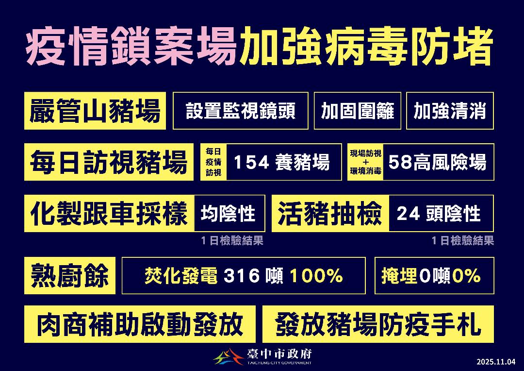 盧市長指出,非洲豬瘟為全球最具威脅性的動物疫情之一,病毒傳染速度快、豬隻死亡率高達百分之百,曾造成中國大陸與越南大規模撲殺與損失。為防止疫情擴散,市府採取全國最嚴格標準,針對廚餘處理、運輸車輛、人員進出及豬隻監測等全面管控。截至目前,台中市其餘154場養豬場、超過8萬頭豬隻皆未受感染,全國其他地區亦保持安全,顯示防疫措施成效顯著。