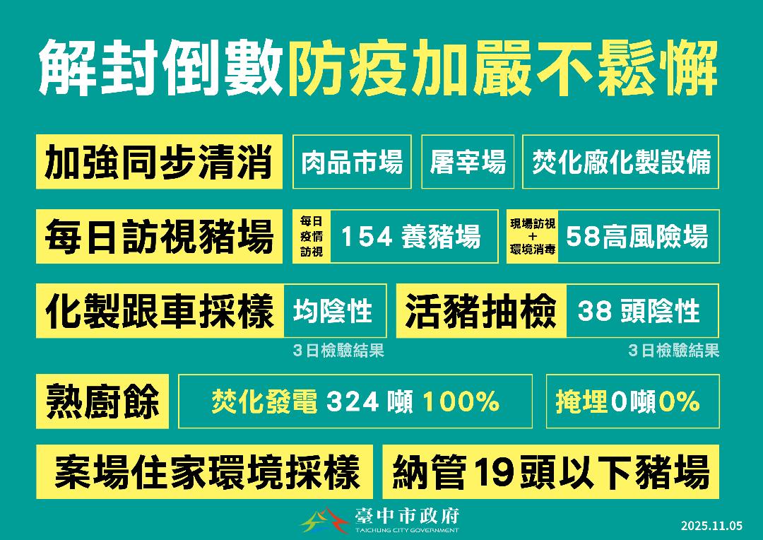 台中市政府嚴守非洲豬瘟疫情,將風險封鎖在台中梧棲案場無外溢,農業部今(5)日下午宣布,中央災害應變中心決定採分階段方式解禁非洲豬瘟相關管制。第一階段自11月6日中午12點起開放活豬運輸;第二階段則從11月7日凌晨起開放批發、拍賣、屠宰及屠體運輸。台中市長盧秀燕上午出席非洲豬瘟前進應變所記者會表示,台中加嚴不鬆懈,加緊腳步防疫到最後一刻;市府已擬定三大配套措施,守護台中、守護台灣,堅持到最後一刻。副市長鄭照新也表示,案例場的廚餘運載車曾到處走,質疑有收受他處廚餘,已稽查案場5公里內的東南亞餐廳。另豬農供述7月仍有蒸煮廚餘,設備何時故障待釐清。由於中央防疫團隊前一天送市府「菱角」祝福台中市早日「清零」,市府今也回禮送檸檬餅感謝協助中央「清零」。