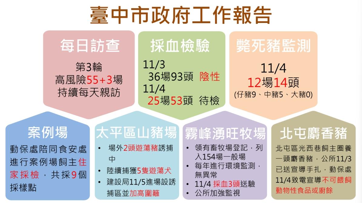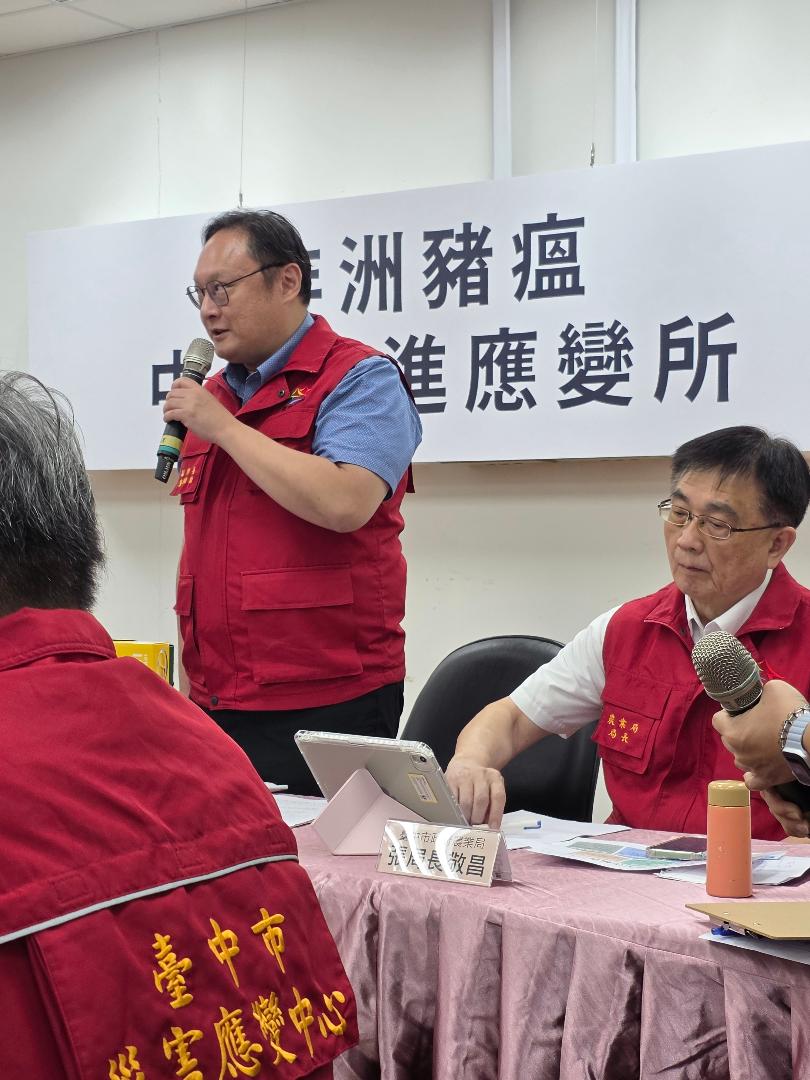 副市長鄭照新針對市府各防疫作為補充說明,肉品市場、屠宰場、焚化廠化製設備加強同步清消;每日訪視豬場及化製跟車採樣檢驗結果皆陰性、活豬抽檢38頭均陰性,熟廚餘共324噸均送焚化廠,100%焚化發電零掩埋,案場住家環境完成採樣送檢,並納管19頭以下豬場。