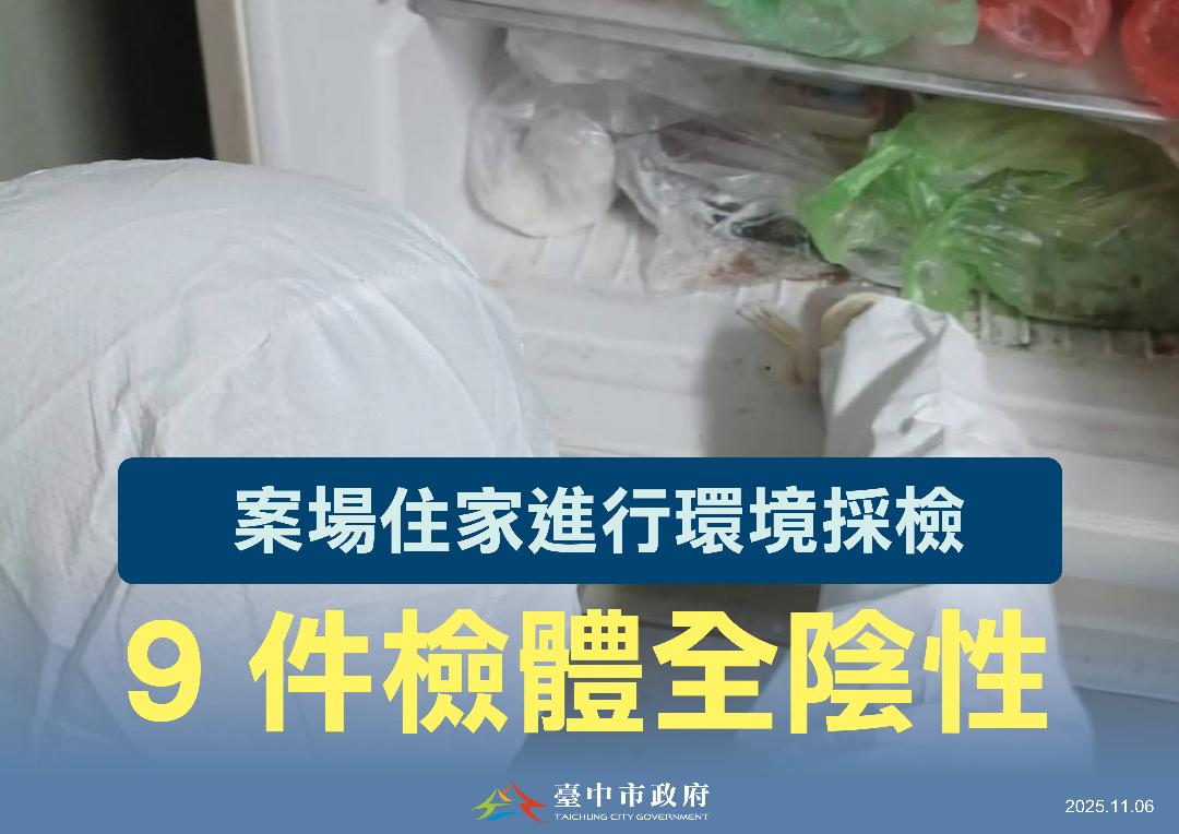截至11月4日,化製跟車採樣與42頭活豬檢驗皆為陰性,廚餘全數採焚化發電,未有掩埋情形;此外,台中發現4頭寵物豬,3頭檢驗為陰性、1頭待檢驗結果。梧棲案場周邊小吃店17家均無違規,案場住家二次採檢,9件樣本亦全數呈現陰性。