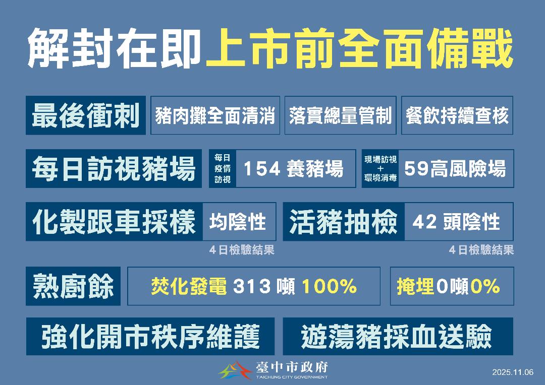 副市長鄭照新表示,雖然禁運禁宰將解封,但市府防疫工作不僅不鬆懈,反而持續加嚴。全市418個豬肉攤持續全面清消,並配合中央推動溫體豬上市後的價格穩定及總量管制。同時,市府強化餐飲業食材品質與廚餘流向稽查,每日訪視154處養豬場,59處高風險場持續消毒監控。