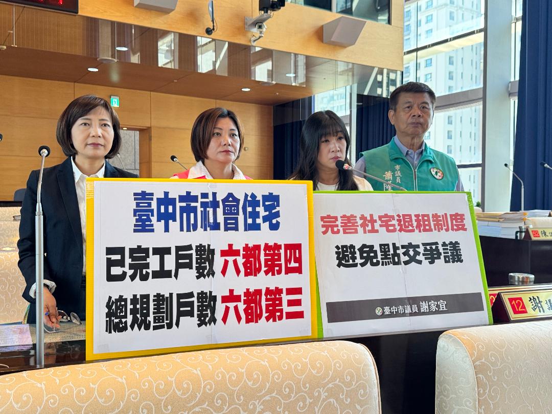 針對市議員黃守達、王立任、謝家宜、陳雅惠、蕭隆澤、陳淑華、張芬郁、陳俞融等議員質詢時關心台中市社會住宅供不應求,社宅興辦進度「已完工」的戶數僅6都第4,近期又修正出租辦法放寬申請資格,恐影響台中市民權益及中籤率,並建議建立完善的退租點交制度,台中市政府都發局說明,依內政部不動產資訊平台114年10月31日統計,台中市府自辦社宅興辦進度「已興辦」戶數為10,231戶,居6都第2、市府目前除優先持續興建1萬戶社宅,也持續盤點土地資源並考量財務及各區需求,採多元興辦方式推動社宅,再搭配中央116年起陸續完工的社宅,將能提供社宅供給量,滿足台中市不同族群的居住需求。