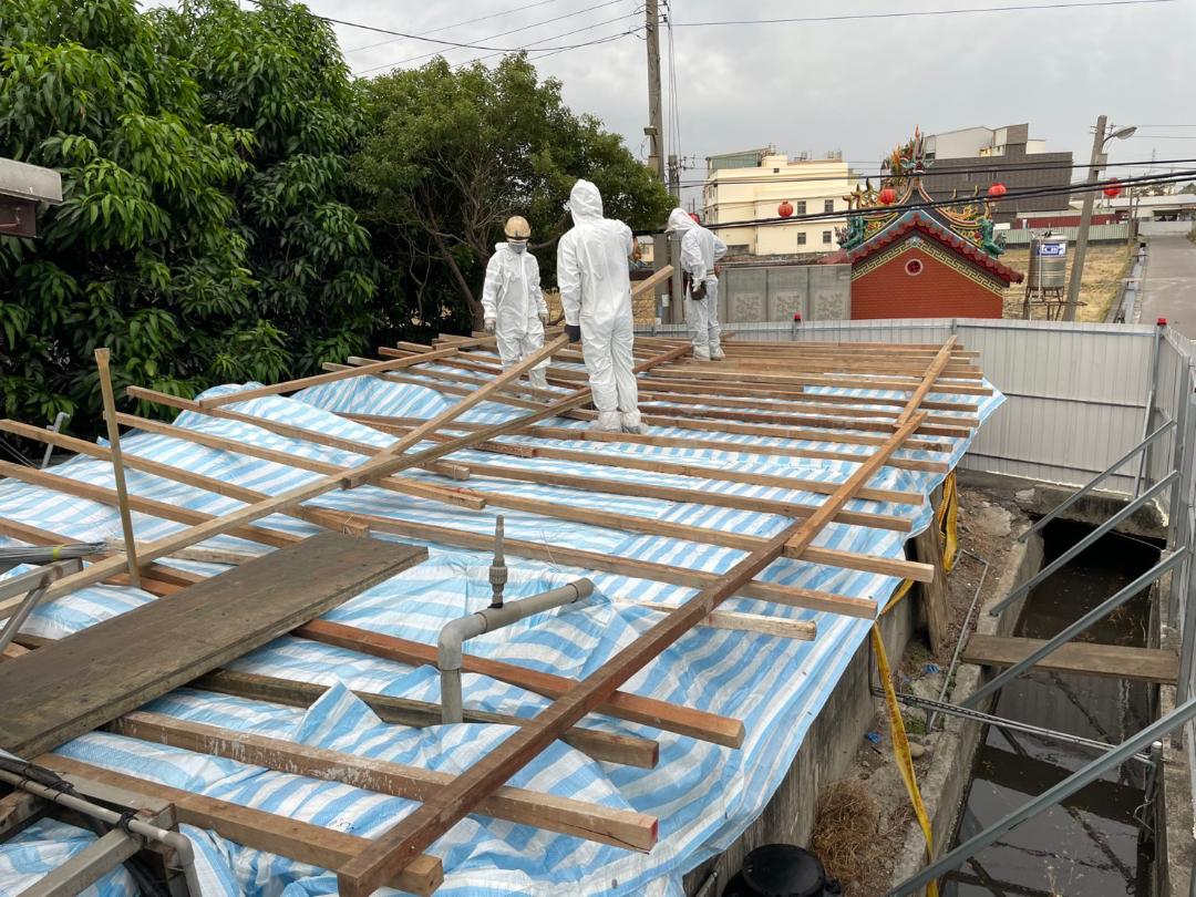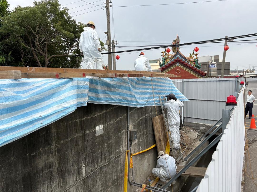此外,因梧棲案例場的污水處理槽內仍有未處理污水,雖然已加入鹼片消毒,但為防範豪大雨造成污水外溢,水利局今(10)日也派員全程穿著防護衣,針對污水處理槽上方開放空間以多層覆蓋方式進行加蓋工程。