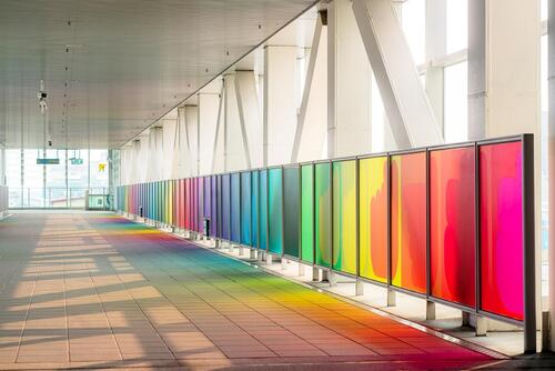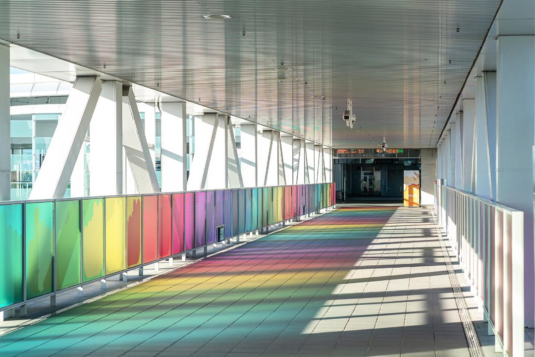 中捷公司說明,當旅客穿越「彩虹天橋」,在轉身或加快腳步時,眼前的色彩會同步產生變化,形成旅客與空間共同構成一幅移動式影像。每位走進作品的旅客,不再只是通勤者,而是融入公共藝術美好畫面的參與者,成為作品的一部分。