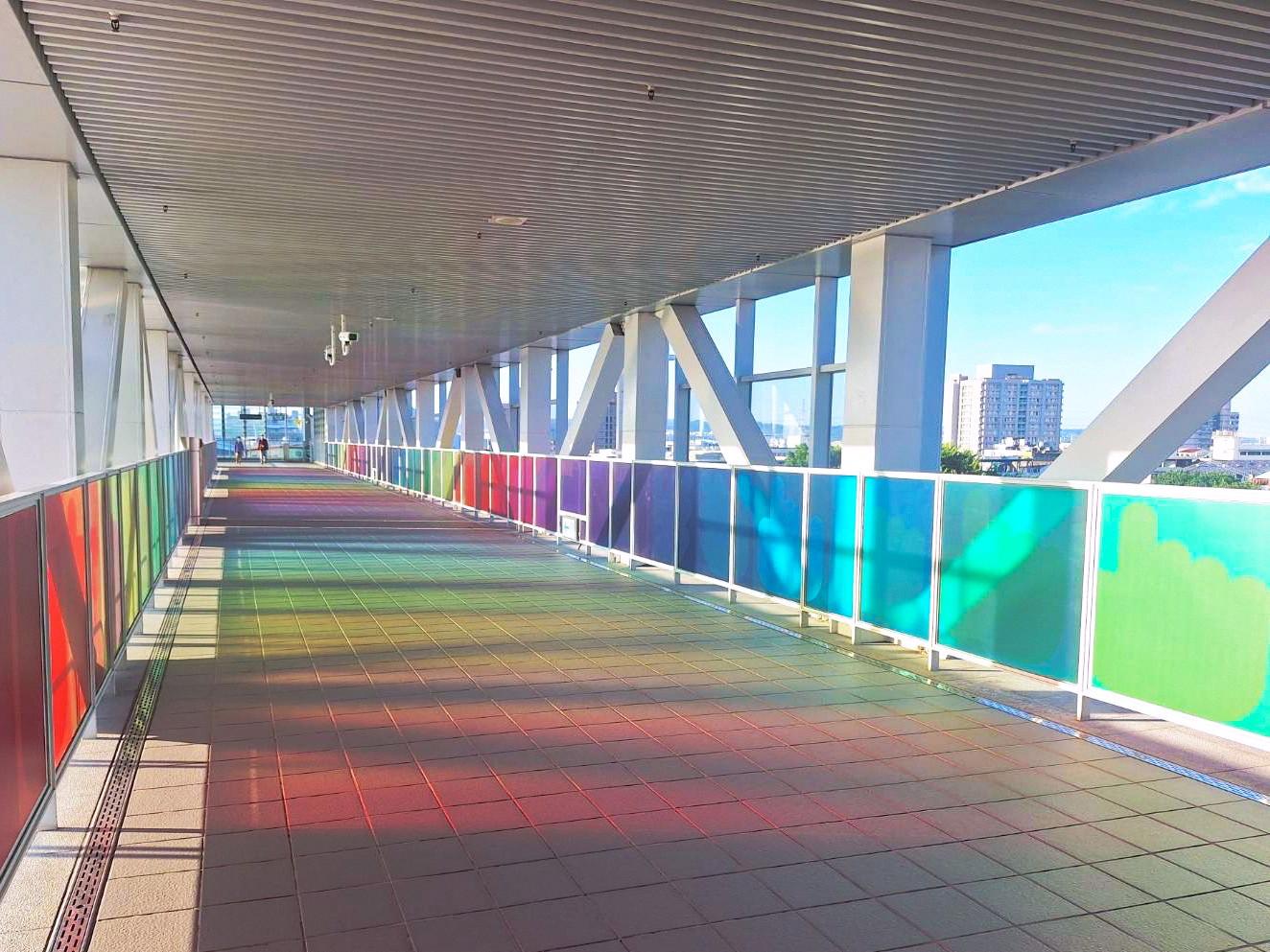 台中捷運烏日站跨站天橋近日換上全新風貌!兩側牆面以代表18個車站的主題色打造視覺廊道,在陽光照射下,絢爛色彩投映在橋上,旅客行進間更會驚喜發現色彩隨步伐變換,有如「行走在彩虹上」。中捷公司表示,這項設計是「公共藝術深耕計畫」的重要成果,將原本單純的通道變成充滿律動與光彩的「流動色彩軸線」,讓旅客移動間自然走進公共藝術,享受沉浸式的體驗。
