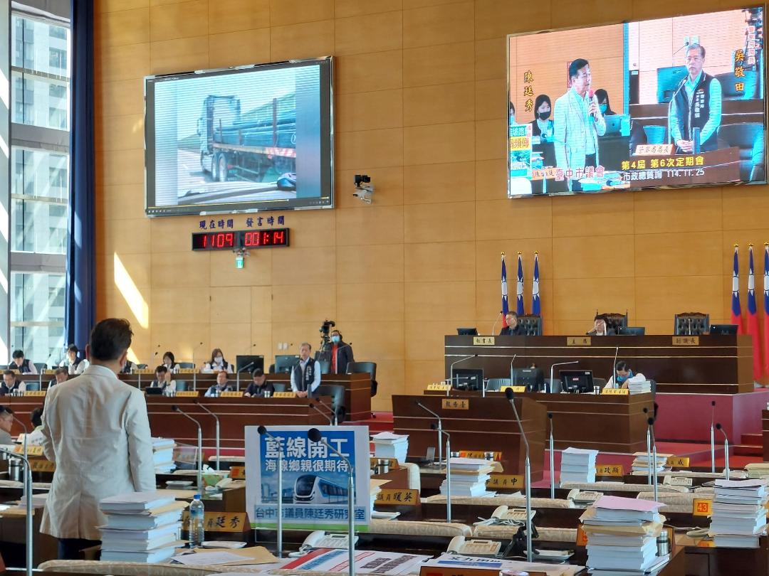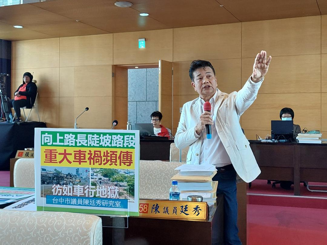 台中市無黨籍議員陳廷秀質詢關心「向上路長陡坡路段重大車禍頻傳 彷如車行地獄」,尤其對於重車行駛亂象提及「超載不止,就是安全最大隱憂」,要求市府對於重車管理要嚴格、取締要確實,更會持續關心、為地方把關!