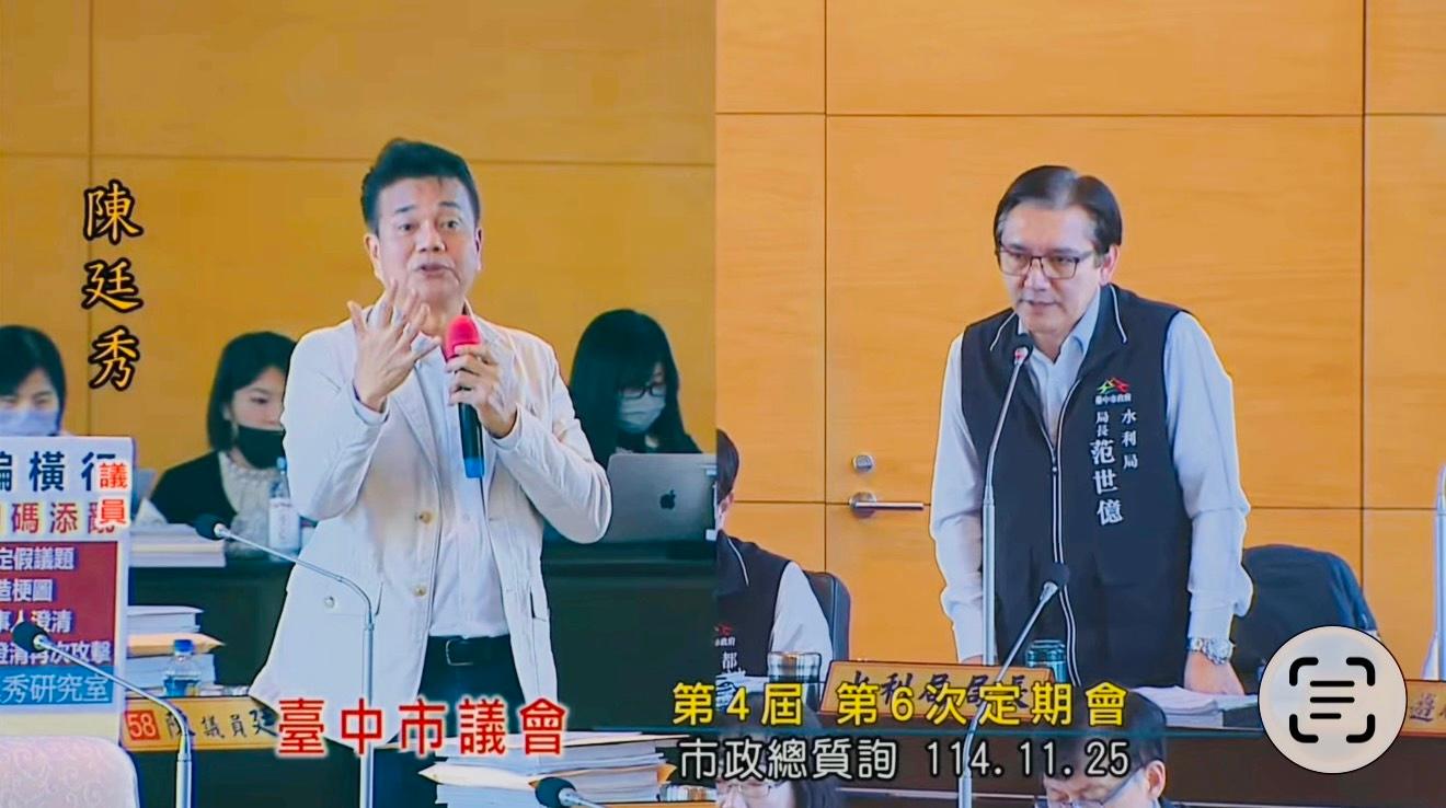 陳廷秀議會中也讚許水利局長范世億,談到對於議會中質詢曾提出,梧棲民族路北側農田長年淹水問題,雖然水利局已提報中央(指農水署)四次,目前仍然被打回票!但范局長於議會中承諾,除了會與中央再進行溝通外,若中央再不做,我們地方水利局自己來做!另對於近期南勢溪的會勘及整治,包含 溪岸週邊欄杆設置、污水分流處理,還有梧棲新市鎮的污水分流工程等,對於水利局處理效能&勇於承擔精神,確實讓海線在地鄉親稱讚不已!