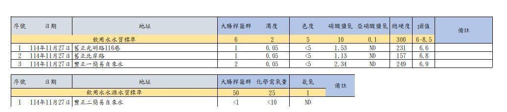 今檢測結果出爐,環保局指出,檢測項目包括大腸桿菌群、化學需氧量、氨氮、濁度、色度、硝酸鹽氮、亞硝酸鹽氮、總硬度、酸鹼值,均符合飲用水標準,其中豐正簡水的水源處,衡量水體污染和水質的重要檢測項目氨氮,和三處飲用水處影響健康物質的亞硝酸鹽氮,都沒有檢出,其餘數據也都低於標準值甚多。