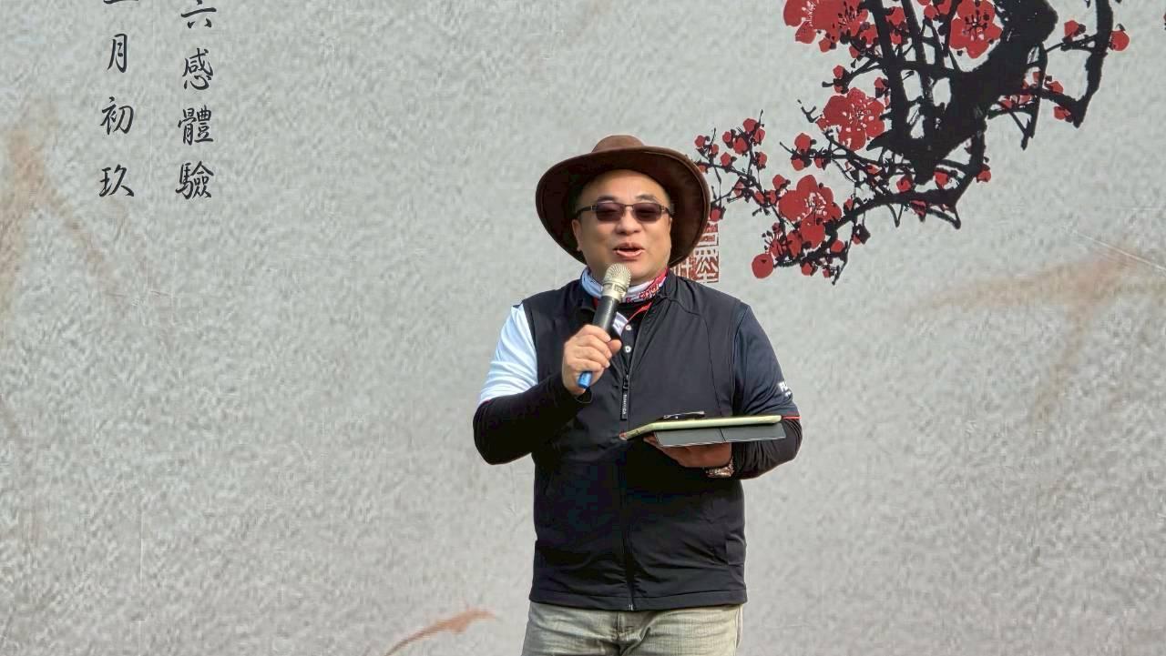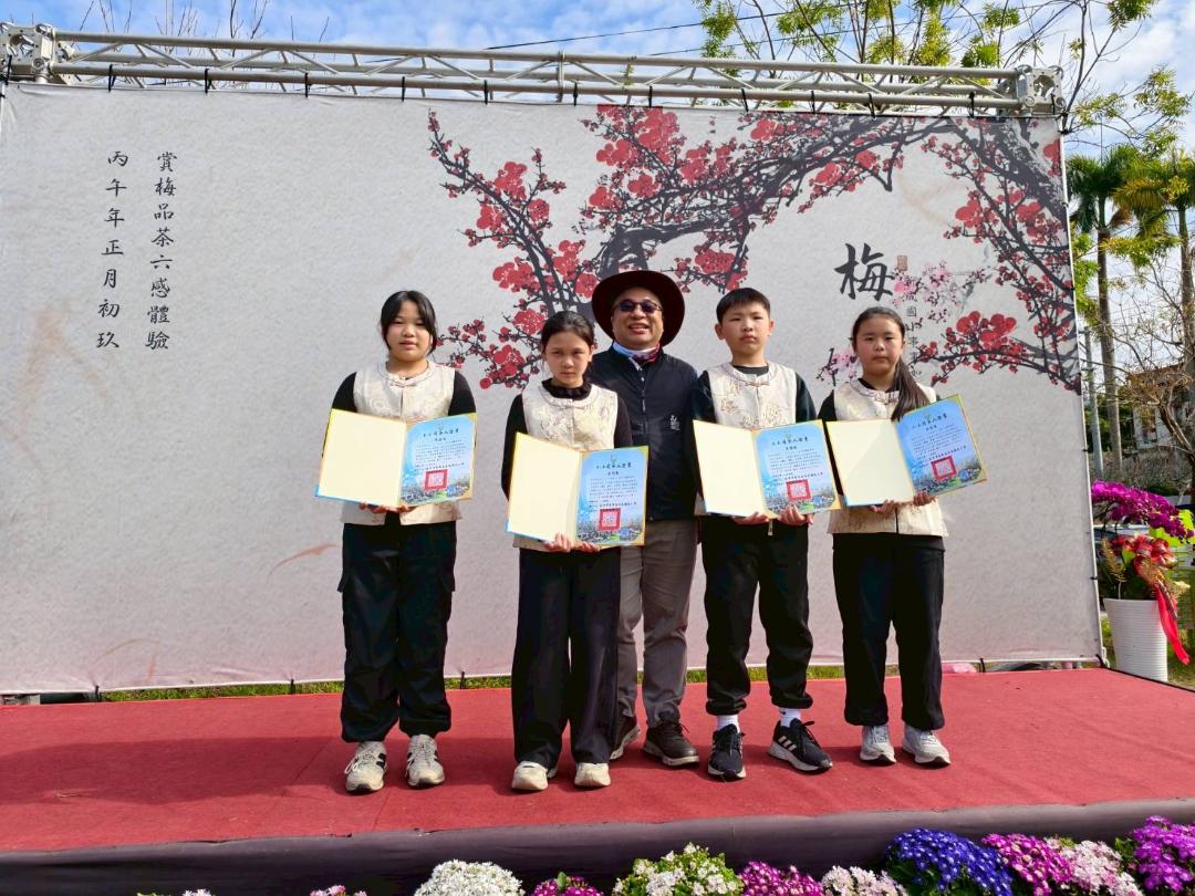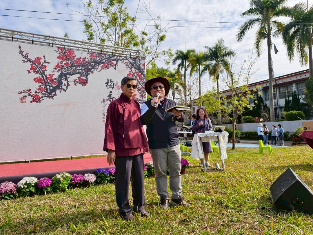 對於新成國小長期深耕客家文化與校本課程給予高度肯定。江主委在梅樹下感性地表示,梅花越冷越開花、堅忍不拔的特質,正是客家硬頸精神的最佳寫照。他強調,新成國小校園內的梅林景緻不僅是學校的資產,其精神象徵更足以代表山城,堪稱是「臺中客家之花」。江主委進一步讚賞學校在林益興校長的帶領下,展現了卓越的「跨域美學」,不僅保留了傳統客家文化的溫厚底蘊,更成功結合現代科技教育,讓「藝文」與「科技」在校園內和諧共生,是客家文化傳承與創新教育的典範。