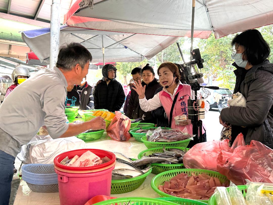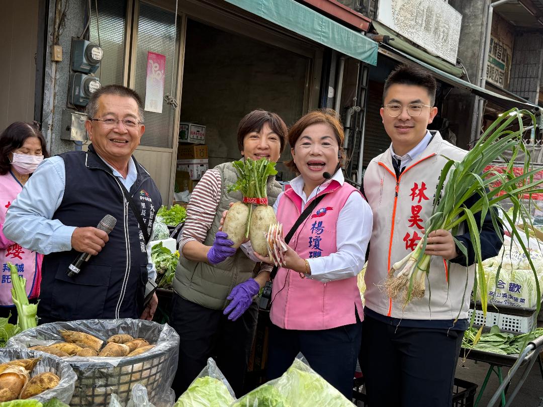 大肚公有市場週日人潮絡繹不絕,楊瓊瓔沿途向攤商、民眾一一問候,親切寒暄、逐攤拜票,展現深耕基層的親民作風。許多攤商與支持者熱情高喊「唯一支持」、「楊市長好」,還有人主動遞上水果、點心為她加油打氣,場面相當熱絡。