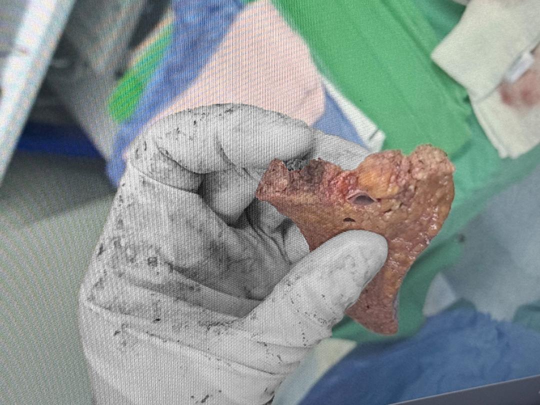 吳坤達說明,即使是肝完全健康的年輕患者,肝臟切除手術至少要保留三分之一才能維持基本生理功能,該患者四到六成脂肪肝又有多顆腫瘤,為了讓她的肝臟能正常運作,脂肪肝切下了223克,大約一顆小蘋果的重量,沒有切除的腫瘤則採用射頻消融治療術讓組織壞死,手術進行大約3個多小時,失血量僅有約400CC,患者術後恢復良好。