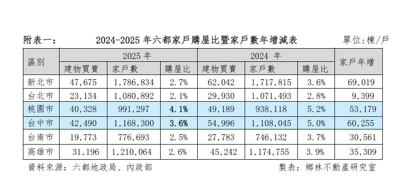 他分析,六都家戶數統計資料,新北市因腹地廣大,2025年增加6.9萬戶居冠,但台中市緊追在後,一年內狂增6萬多戶(從110.8萬戶成長至116.8萬戶),遠甩高雄、桃園等城市。且台中家戶購屋比仍維持在3.6%,僅次於桃園的4.1%,高於雙北與台南、高雄。這意味著每100戶台中家庭中,就有3.6戶在2025年進場買房(附表一),顯見台中房市「退燒但未降溫」。顯示中台灣就業機會與生活環境,對年輕族群與外來人口具有強大的吸引力。