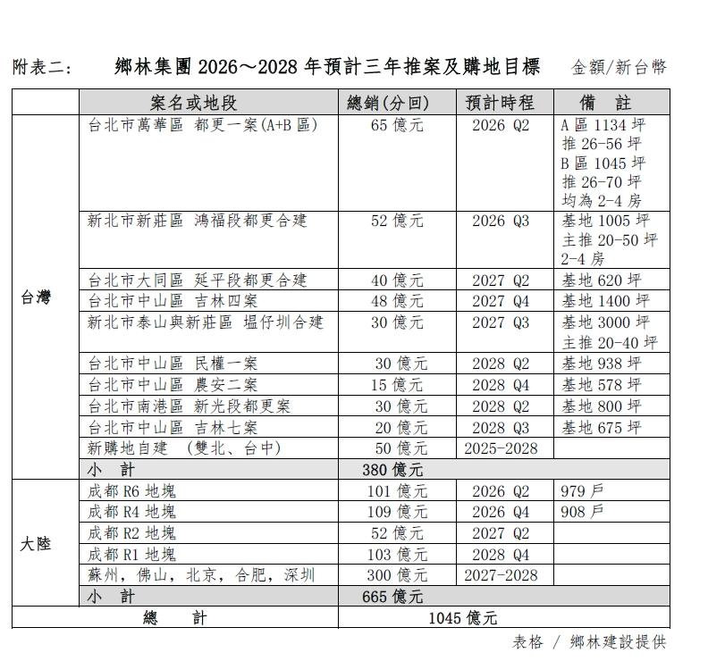台北「鄉林中山賦」、雲林「鄉林雲峰」、北投「鄉林靜岡」三個預售案都近完銷,顯見銷售動能持續、剛需市場仍在,只是成交速度變慢些。萬華與新莊都更預售案2026年Q2及Q3接棒推出,總銷分別是65億元與52億元。新北市塭仔圳也談判了數塊土地約3000坪,台北市中山區新松町新城計畫與大陸成都推案也會看好時機推出,並續推「品牌輸出計畫」及第二個品牌「阿瑪尹」 (Amayi)進軍全球飯店市場,已在北京大興、上海、廣東深圳、佛山、江蘇蘇州與安徽合肥等城市選地,並與好市多COSTCO商場合作(附表二)。