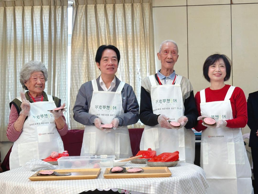 隨後,賴總統也穿上圍裙,在83歲祖蔭奶奶的指導下,親手製作喜氣的紅龜粿,賴清德總統分享說,以前年節時也會跟著媽媽一起做紅龜粿;邱阿公也陷入回憶的說,上次親手做紅龜粿已經是小時候過年時,和媽媽一起做的了。祖蔭奶奶是弘道西區老拾光日照服務的長輩,因聽力、視力與肌力皆漸弱,女兒希望媽媽能多些社會參和延緩退化而來到日照,服務中照顧秘書發現奶奶非常喜歡與擅長料理,所以日照廚藝活動也經常借助她的經驗來製作各種米麵食,藉此讓的擅長有更多的發揮,奶奶從中也獲得成就感。賴總統跟著祖蔭奶奶將豆沙內餡放進粿皮中包起來,再放到模具上緊密壓實後,拍打出來就完成了紅龜粿,將喜氣與福氣送給在場的所有長者們。