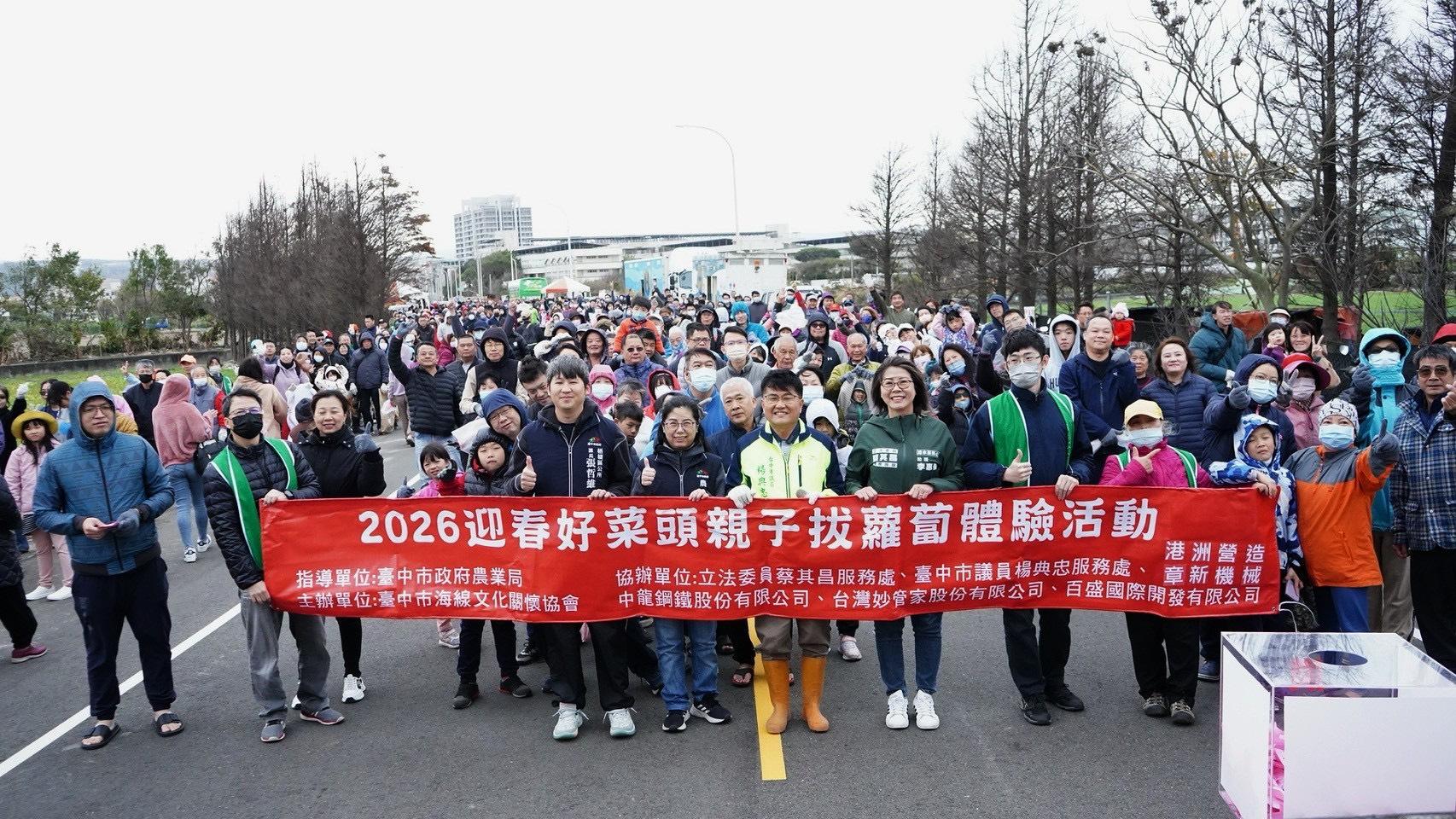 台中市議員楊典忠與海線社團第二年舉辦迎春好彩頭拔蘿蔔活動,再次吸引兩千民眾響應參加,楊典忠說,去年活動中不少家長反映,因參與人數眾多,小朋友經驗不足,拔蘿蔔輸給大人,今年特別開闢親子區給小朋友拔,讓大家都能體驗到拔蘿蔔的樂趣。