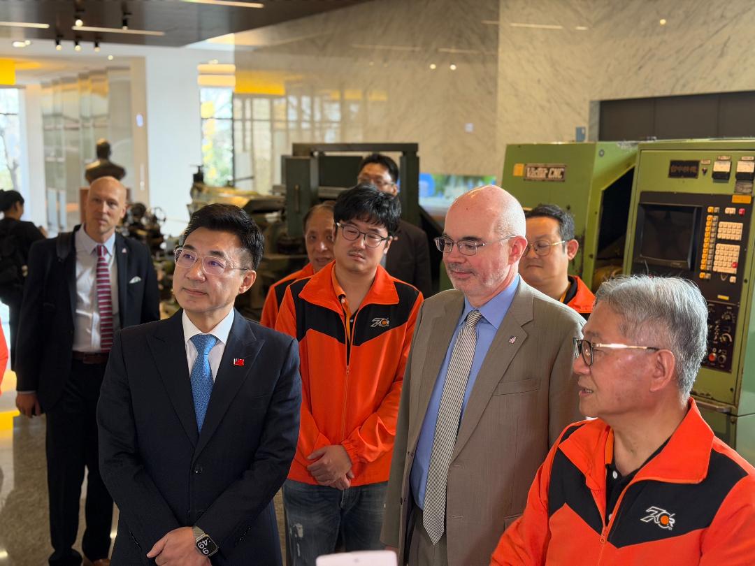 立法院副院長江啟臣今(6)日邀請美國在台協會(AIT)處長谷立言(Raymond Greene)共同參訪台中精機,並出席由台灣AI機器人產業大聯盟主辦的「中部AI機器人產業發展交流座談會」。盧秀燕市長呼籲中央加碼投資,串連中南部形成「科技中南半島」,以數位力強化城市競爭力,領航台灣科技飛向世界。江啟臣在會中倡議,應在台中規劃設立「AI機器人產業園區」,整合中部既有的精密機械優勢,並爭取與美國在新創及研發上的深度合作,讓台中成為美方在AI機器人領域可信賴的夥伴。