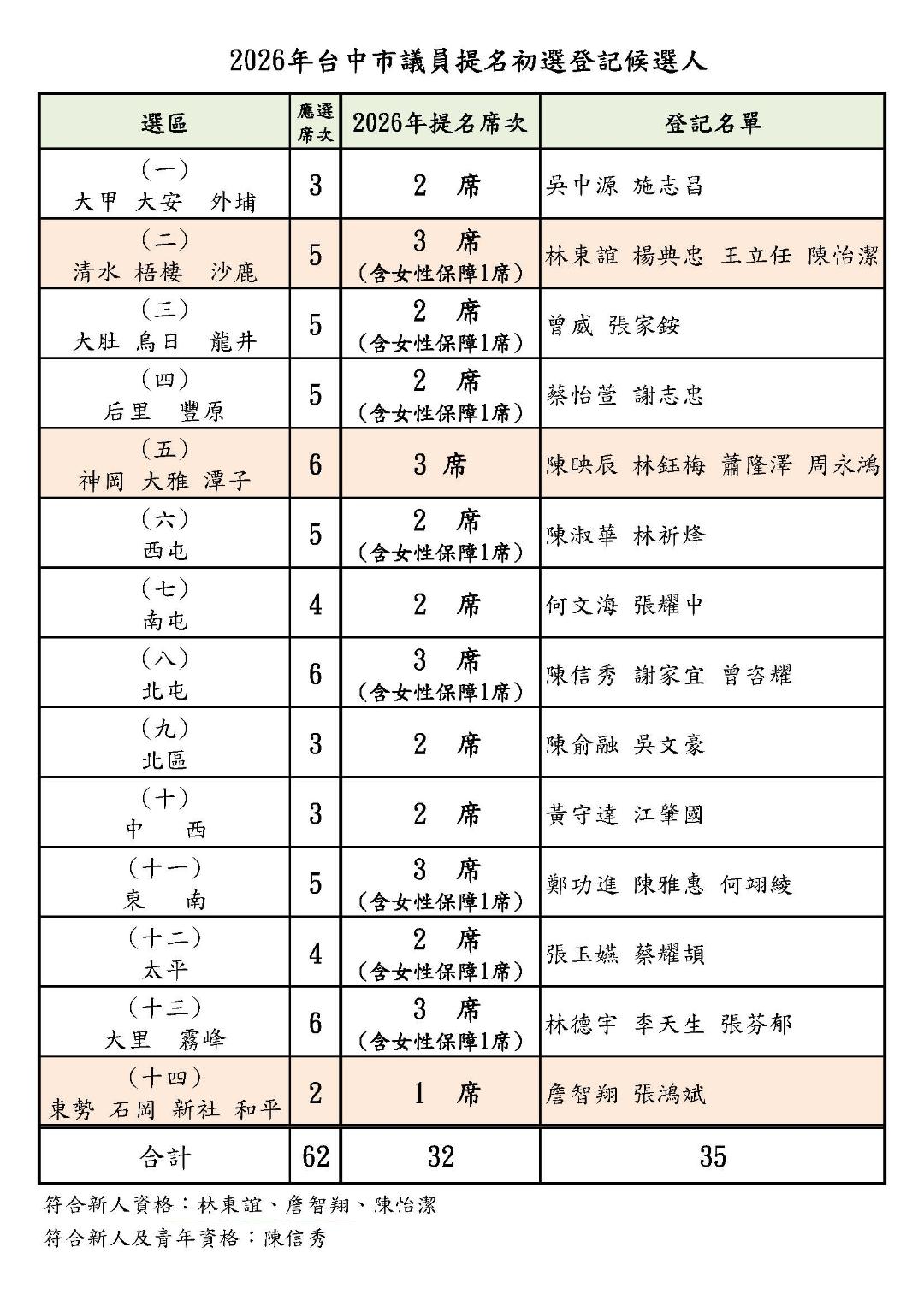 民主進步黨台中市黨部於2月4日至2月10日(放假日除外)開放市議員黨內提名初選領表登記,今(10)日為領表登記最後一天,總登記人數為35位。登記截止後協調至2月13日前;若需辦理初選民調,將在3月2日至4月10日舉行。市黨部主委許木桂表示,為期五天的領表登記一切都順利 ,感謝大家對民進黨的支持與期待。主委強調,這次有三個選區(二、五及十四 選區)需藉由民調來完成提名,但不管如何,黨部是未來提名候選人的後盾,黨部一定會盡最大全力來協助每一位,並期待所提名32席議員全壘打,市長當選、議會過半。