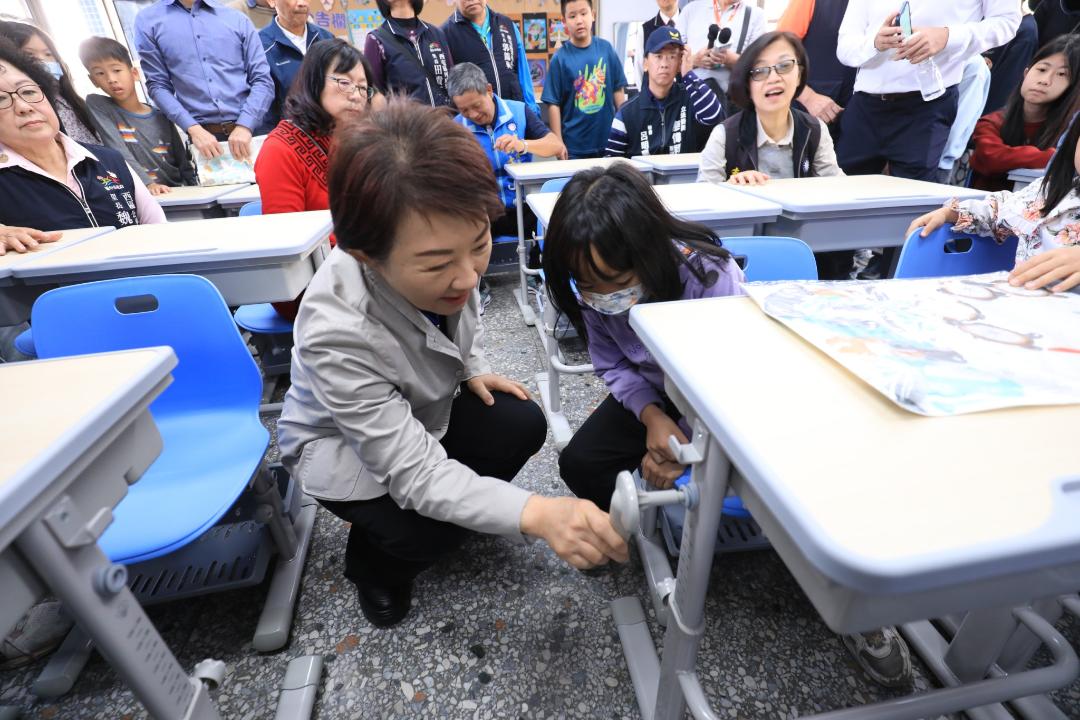 「椅子太硬,坐一整天屁股會有一條一條的痕跡!」盧市長分享,自己曾在東興國小擔任過導護媽媽,對學校很有感情,以往的課桌椅都是木製的,個子高的小朋友縮在小小的課桌椅裡面,個子小的小朋友坐在高高的課桌椅,坐起來很不舒服!小朋友一整天在學校的時間很多,如果課桌椅高度不適合的話,會影響到發育、健康跟學習專注力。