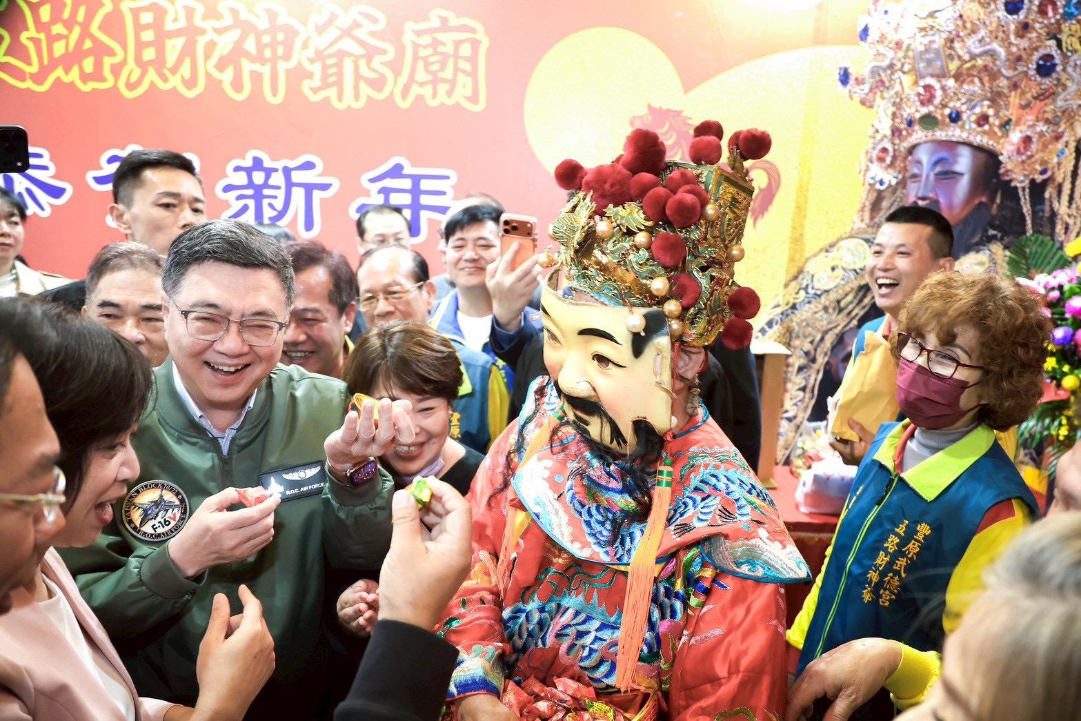 今(20)日年初四是迎財神、補財庫的日子,行政院長卓榮泰偕同李慧芝發言人及何欣純立委前往臺中市豐原武德宮及東勢東聖宮參拜祈福,祝福家家戶戶賺大錢、大大小小都平安。現場也湧入許多排隊領取總統福袋的民眾,人潮絡繹不絕,希望能夠沾滿喜氣、獲得好運。卓院長此行也至東聖宮旁的東勢區農會果菜市場向攤商拜年並發送賀歲福袋,祝福大家新年快樂,攤商也回贈水梨給院長,並與院長合影留念。