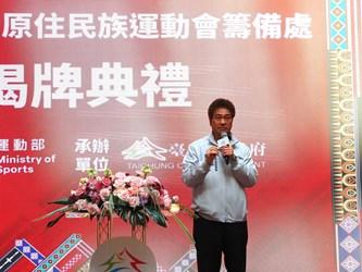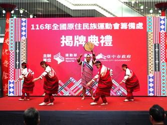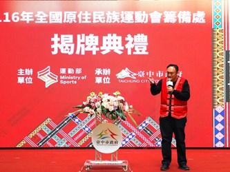 116年全國原住民族運動會籌備處今(26)日在市府文心樓一樓中庭正式揭牌,典禮以原住民族特色樂舞揭開序幕,現場邀請台中市原住民健將陳傑及奧運柔道國手楊勇緯及林真豪到場力挺,象徵原住民族運動精神的傳承與延續。副市長鄭照新代表盧市長出席,與現場貴賓共同啟動揭牌儀式,正式宣告賽會將於明年3月26日至29日在台中登場,屆時歡迎全國16族、超過8,000名原住民隊職員將齊聚台中,切磋競技!