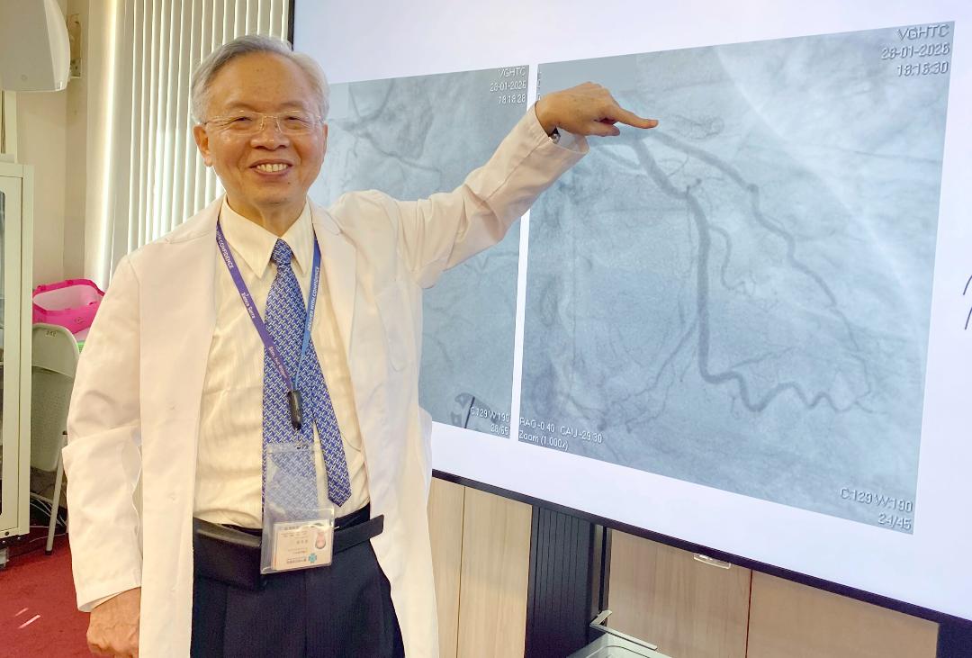 臺中榮總心血管中心李文領主任指出,75歲洪先生因慢性冠心症接受心導管介入手術,不料術中突發少見的右冠狀動脈急性閉塞,引發心因性休克,心跳過慢,呼吸衰竭須插管。彰化醫院穩定生命徵象後轉送臺中榮總,心導管團隊以逆向導絲合併正向鑽入型微導管,成功打通嚴重鈣化且長段閉塞的右冠狀動脈,此高難度技術通常用在治療慢性全阻塞血管(CTO),須仰賴精準與細緻的導絲操控,確保導絲全程行走在血管真腔內,李文領主任帶領團隊成功打通血管,放置支架,洪先生術後第3天恢復正常心律並成功脫離呼吸器,第5天順利出院。