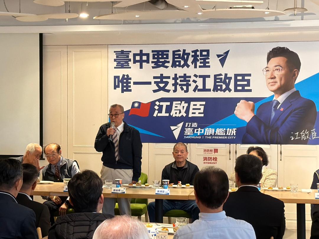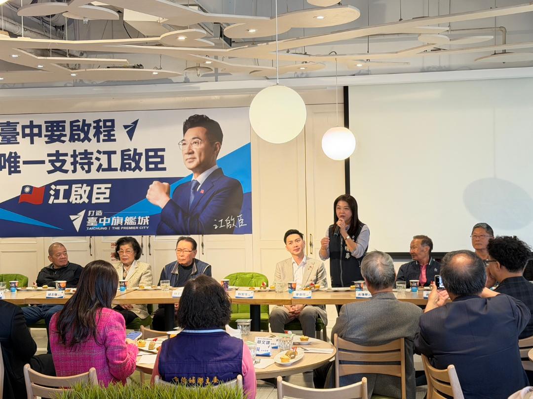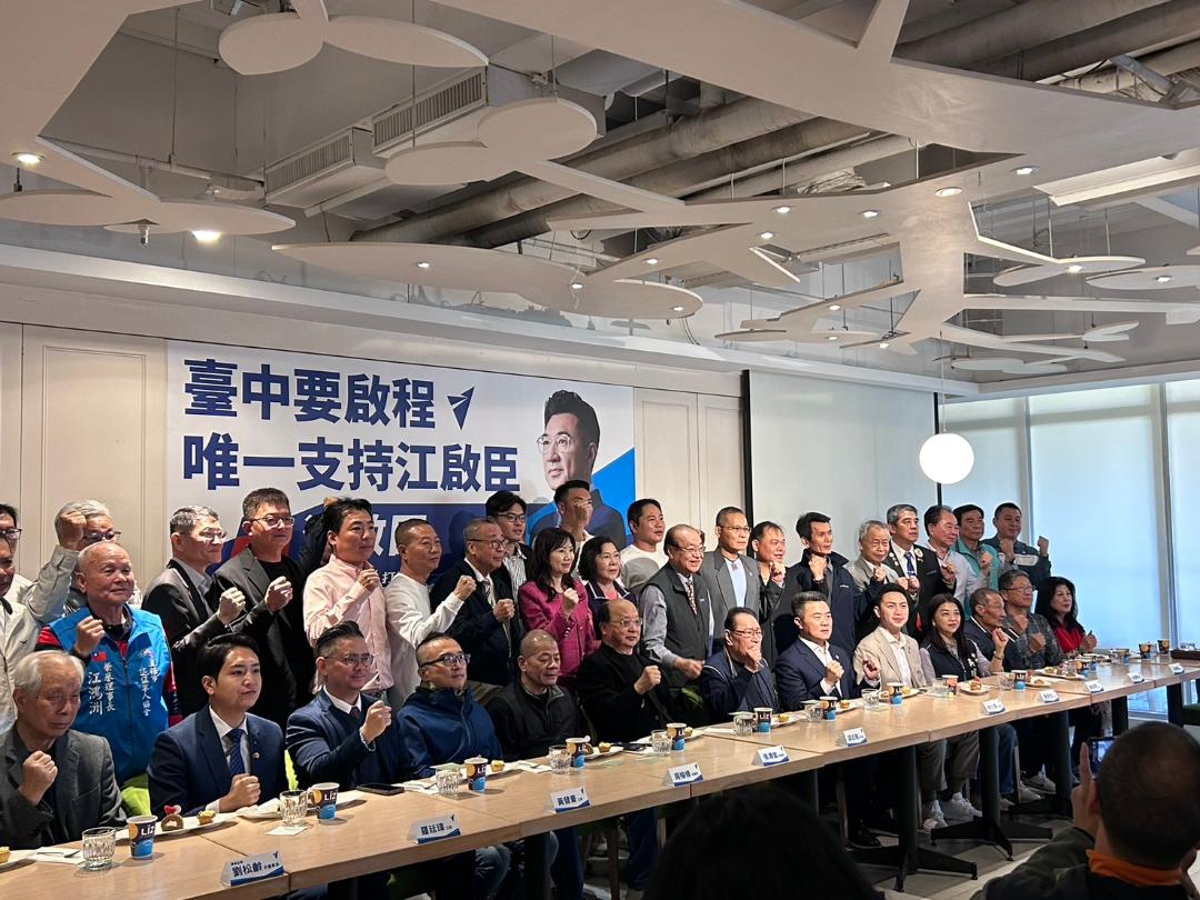今(12)日由前臺中市長胡志強、前臺中縣議長林敏霖、前臺中縣長廖了以等共同出面邀集,臺中現任的四位立法委員包括顏寬恒立委、黃健豪立委、羅廷瑋立委、廖偉翔立委,及臺中市議員等民意代表、民眾黨秘書長周榆修,與前國策顧問蔡鈴蘭、歷任議會議長張清堂、林士昌、各宗教團體、各工商農漁會、眾多熱心公益團體組織等地方人士茶敘,且共同發表聲明。各方共同表示,臺中市在邁入未來發展的關鍵時刻,一定要延續執政,不要讓民進黨挑對手,請市民朋友們唯一支持最優秀的人才江啟臣。胡志強也說:「楊瓊瓔委員是我的好朋友,她來看我,我跟她坦白說明,我有一個8年之約,我不能改,而且她說過一句話,說選擇是殘酷的。」江啟臣則因為接待外賓沒到場但也感謝前輩們的支持,楊瓊瓔則是維持自己步調,持續勤跑基層活動,強調要用接地氣的方式,接觸選民,爭取認同。