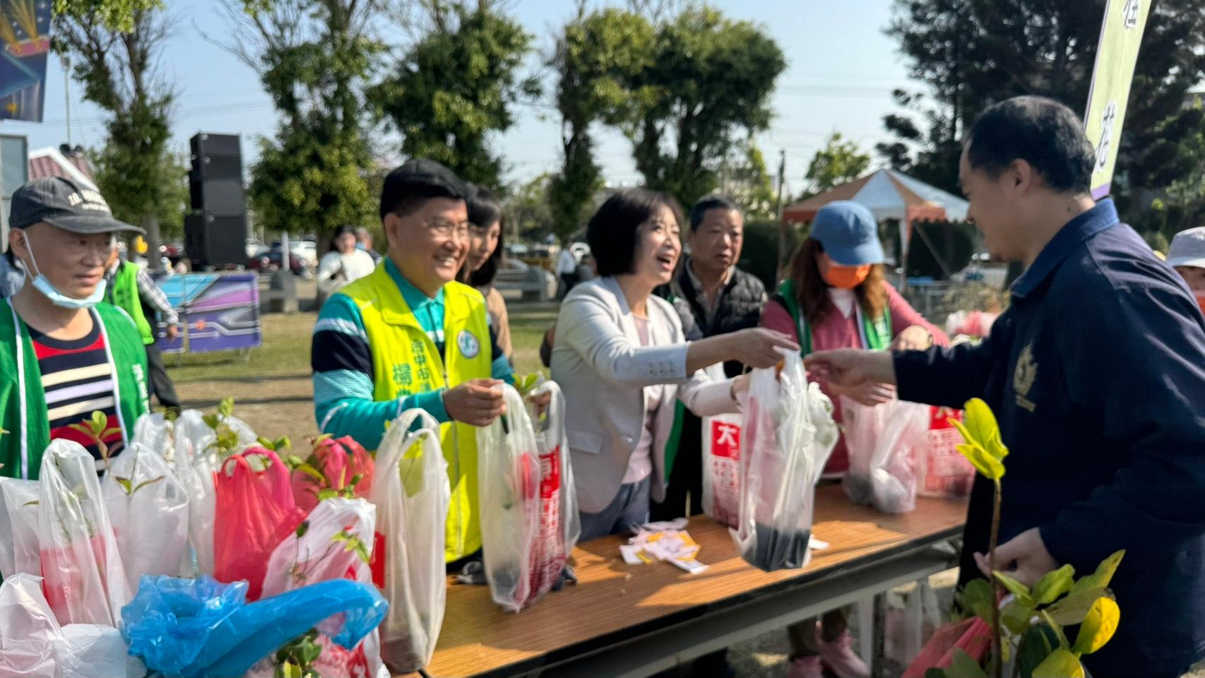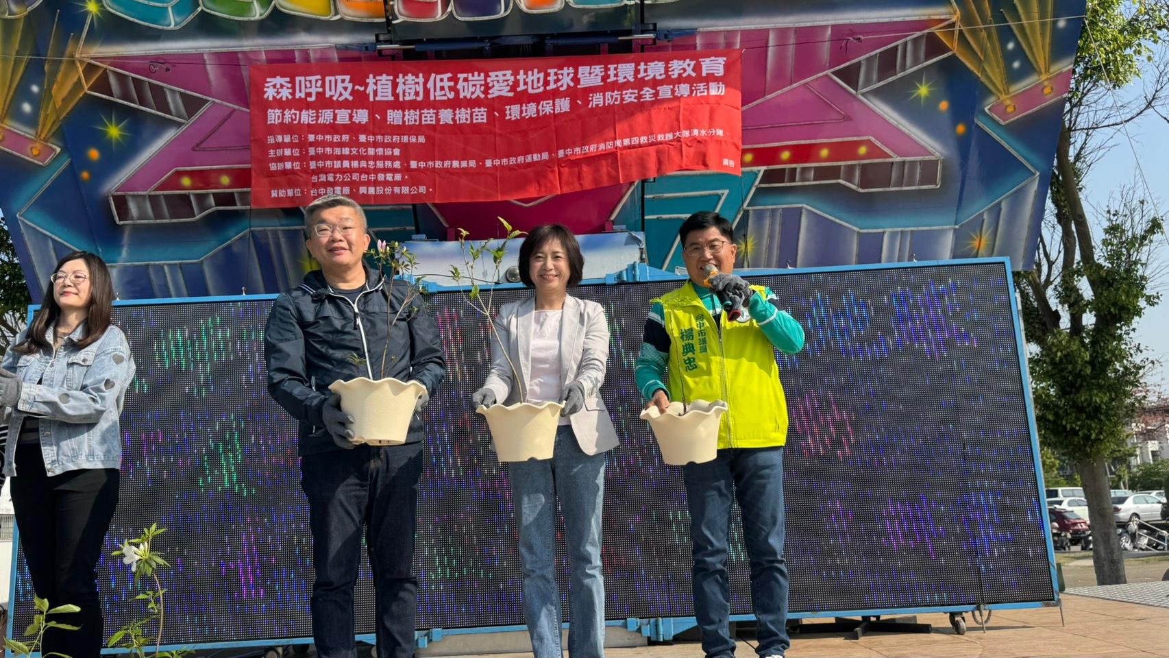 近日大肚山一帶火燒山頻傳,引發各界對山林保育與環境永續的關注,台中海線地區每逢乾燥季節,山坡地火警與空氣品質問題年年都在提醒市民維護自然環境的重要性,為了喚起民眾對植樹護林與環境保護的重視,台中市海線文化關懷協會今(15)日上午在清水運動場(大秀運動公園)舉辦2026「森呼吸.植樹低碳愛地球」贈樹苗活動,吸引大批民眾一早前來排隊領取樹苗,台中市議員楊典忠特別邀請民進黨台中市長候選人何欣純、民進黨立法院黨團總召蔡其昌到場共襄盛舉,一起將綠色希望送到市民手中,也透過實際行動呼籲大家一起守護海線環境、種樹護台中。