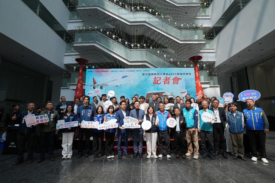 今日記者會,立法院副院長江啟臣、立法委員羅廷瑋、市議員劉士州、睿奕交通股份有限公司董事長吳國正、交通部觀光署副組長陳軒弘、交通部民用航空局台中航空站組長鍾政淋、文化局長陳佳君、社會局長廖靜芝、研究發展考核委員會副主任委員李秀香及南屯區長林秋萬等人皆出席;立法委員楊瓊瓔、黃建豪、廖偉翔、陳清龍、黃仁、市議員邱愛珊、李中、林霈涵、黃馨慧、黃守達也派代表到場共襄盛舉;航空公司、觀光公協會也到場共襄盛事。