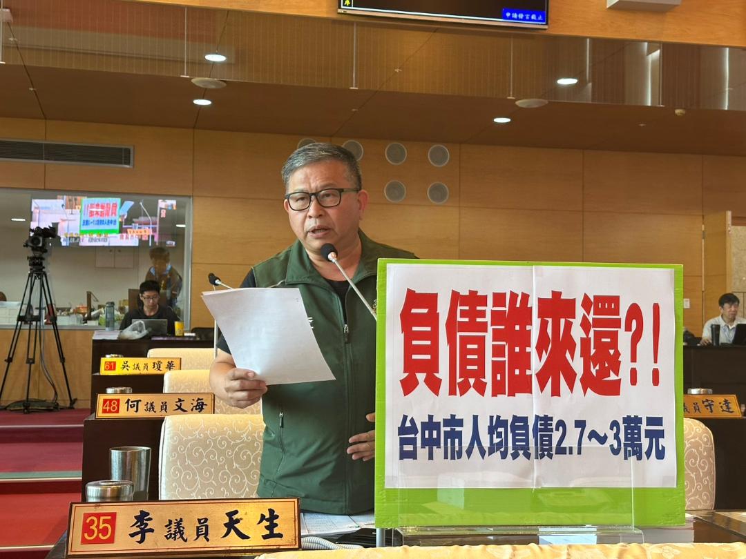 李天生並質疑,台中市規劃捷運「七線齊發」,將邁入建設高峰期,再加上免費營養午餐、老人健保等社會福利支出,經費龐大,預期市府債務將持續成長,請問盧市長缷任後要留給台中市民什麼樣的「財政藍圖」?