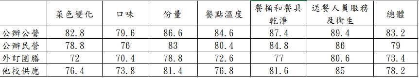 黃守達進一步指出,根據台中市教育局去年年底做的臺中市學校午餐滿意度大調查,「菜色變化」「口味」「份量」「溫度」「餐桶乾淨」「送餐衛生與服務」幾個項目評比下來,公辦公營每個項目得分皆為最高,外訂團膳則是相反,每個項目都為最低分,總體兩者差距甚至高達10分。