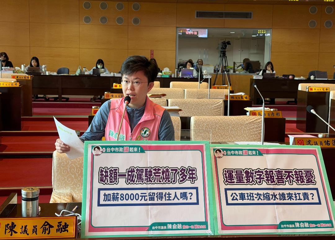 今日台中市議會舉行專案報告,市議員陳俞融指出,目前台中公車駕駛員額應為1,420名,實際僅有1,265名,缺額約155人,佔比接近11%。這不是新問題,報告也指出疫情期間即已造成從業人員流失,但截至115年3月,缺額依然維持一成。陳俞融呼籲市府應正視公車駕駛荒的問題。