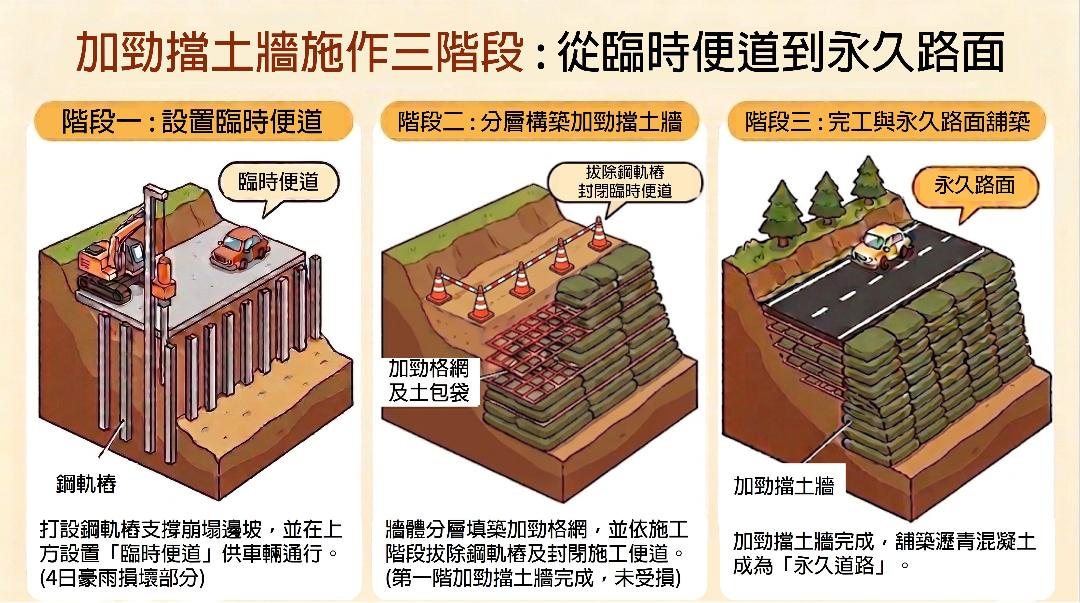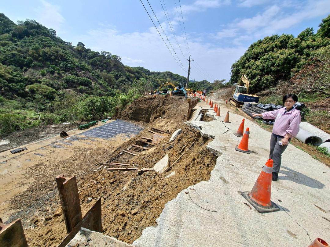 水利局指出,該路段施工期間有替代道路可供通行,未影響民眾通行,並已加速施作第二、第三階段加勁擋土牆及永久路面舖設作業。工程預計於今年5月30日前完工,完工後將有完整道路供民眾通行,維護行車安全。本案中央核定總經費約新臺幣1,600萬元,路面修復長度合計約380公尺。