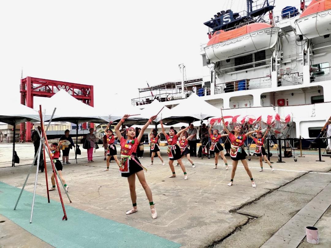 觀旅局補充,為呈現台灣民族風格及本市青少年學子青春活力氣息,由采逸舞蹈藝術中心帶領舞者參與迎賓演出,該中心於2024年代表台灣參加Dance World Cup全球決賽,榮獲青年民族小團體舞第一名佳績。演出中,采逸舞蹈藝術中心舞者首先帶來節奏鮮明、充滿律動感的「竹竿舞」,以有力的敲擊節奏與靈巧穿梭於竹竿間的舞步,展現高度技巧與活力;接著運用糖葫蘆道具演出不同民俗風格,隨著輕快旋律展現俏皮舞步與燦爛笑容,重現童年回憶的純真與幸福。整體演出讓現場遊客留下深刻印象,紛紛駐足觀賞並合影留念。