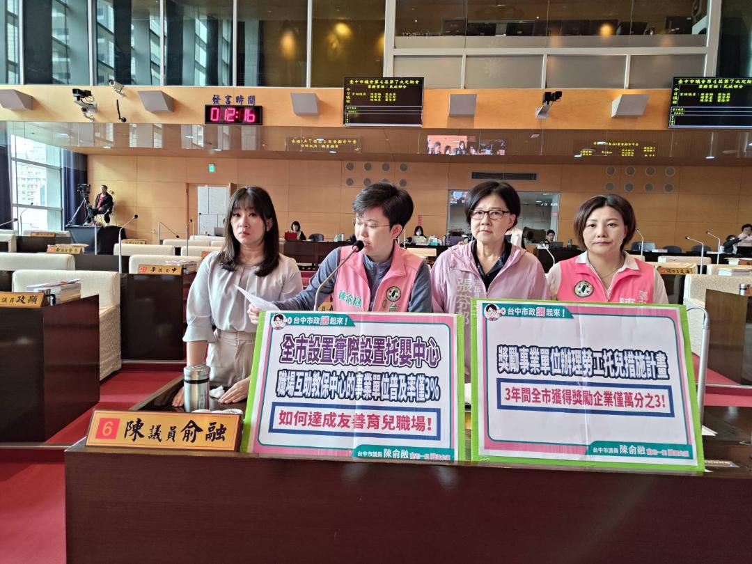 陳俞融指出,根據市府統計,台中市全市應設置托兒設施或措施之事業單位共計925間,但實際設置「托嬰中心、幼兒園或職場互助教保中心」的事業單位僅26家,普及率僅有低迷的3% 。此外,勞工局辦理的「獎勵事業單位辦理勞工托兒措施計畫」,112年至114年共3年期間,僅提供48家企業獎勵,總金額126萬7,000元。陳俞融批評,但台中市公司登記家數高達12萬4,857家 ,現行的獎勵家數與金額簡直是杯水車薪,根本無法形成誘因鼓勵廣大企業投入。