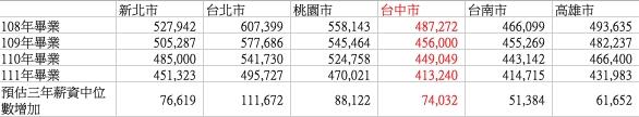 施志昌進一步分析,台中的薪資問題不僅是「起跑點」輸人,連「耐力賽」也跑不動。數據顯示,即便工作三年後,台中畢業生的年薪排名僅上升一名,位居倒數第二。在薪資漲幅上,台中三年預計增加約7.4萬元,遠不及台北市的11.1萬元。施志昌感嘆,台中的年輕人起步慢,跑了三年還是追不上別人,這叫年輕人如何看見未來?