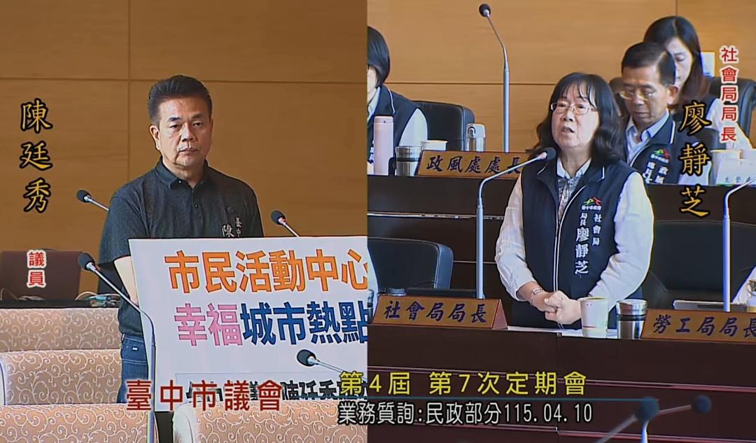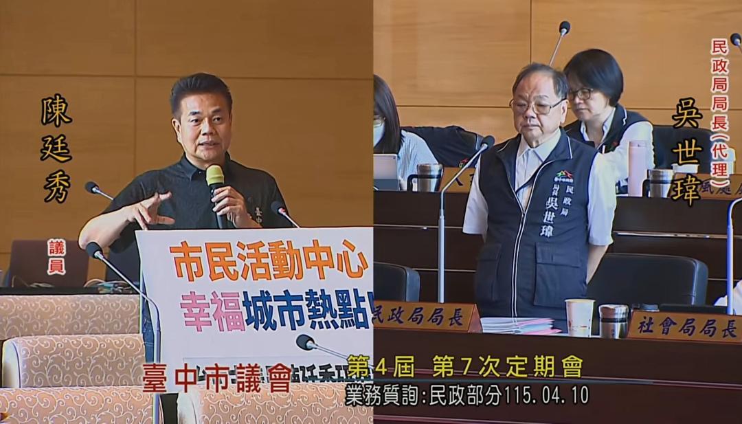 台中市無黨籍議員陳廷秀今(10)日議會進行「民政業務」中,質詢有關「市民活動中心」議題,首先肯定市民活動中心功能性強,尤其在盧市長主政之後,在選區梧棲陸續有包含:四里、三里,還有兩里的活動中心,目前轄區內三里活動中心也在如火如荼的進行中,預計年中可以來完成!讓海線梧棲也成為台中幸福城市熱點!