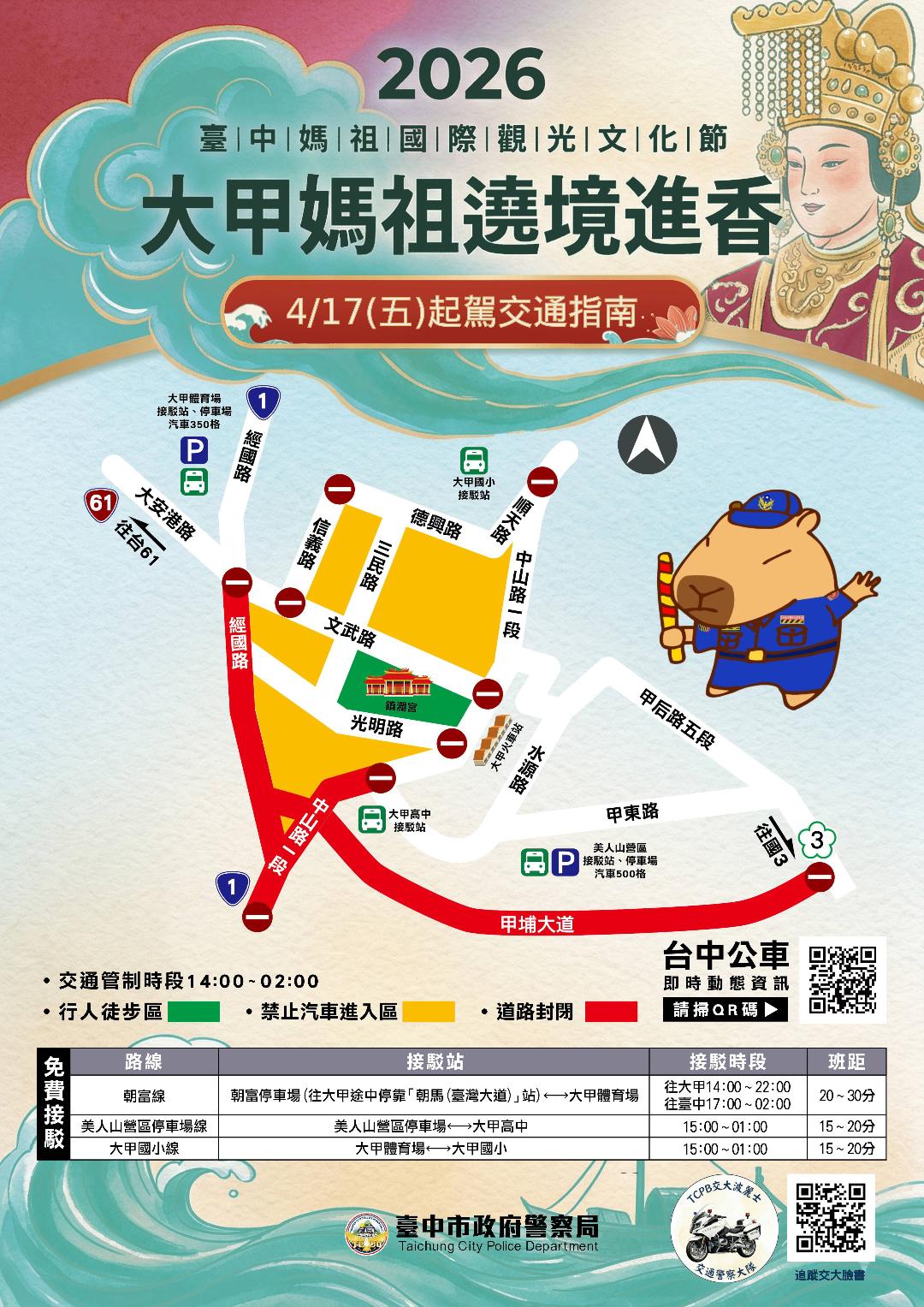 本次活動將115年4月17日22時5分由大甲鎮瀾宮起駕、4月18日中午自大肚區大度橋離開臺中市南下遶境至嘉義縣新港鄉奉天宮、4月25日回鑾由大度橋進入臺中市、4月26日23時許進入鎮瀾宮安座,為期9天8夜,期間將帶來更大量人潮、車潮,為維護交通秩序,4月17日起駕當日,下午2時至凌晨2時將實施三層管制措施,於下列路段進行交通管制: