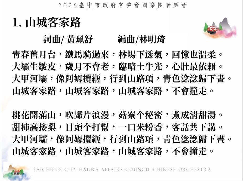 今年為迎接創團15周年里程碑,特別邀請金曲獎常客、當代客家音樂人黃珮舒,擔綱詞曲創作及演唱新作《山城客家路》。該曲以獨具風味的「東勢大埔腔」深情吟唱,透過美聲訴說山城情懷,帶領聽眾穿梭於鐵馬古道與果實清香中,以音樂細膩傳達台中山城的人文魅力;3月28日在嘉義政府文化局音樂廳首演,深獲好評,吸引眾多樂迷進場聆聽,台中市副市長鄭照新及嘉義市長黃敏惠也到場,與樂迷朋友一同感受客家音樂的魅力。